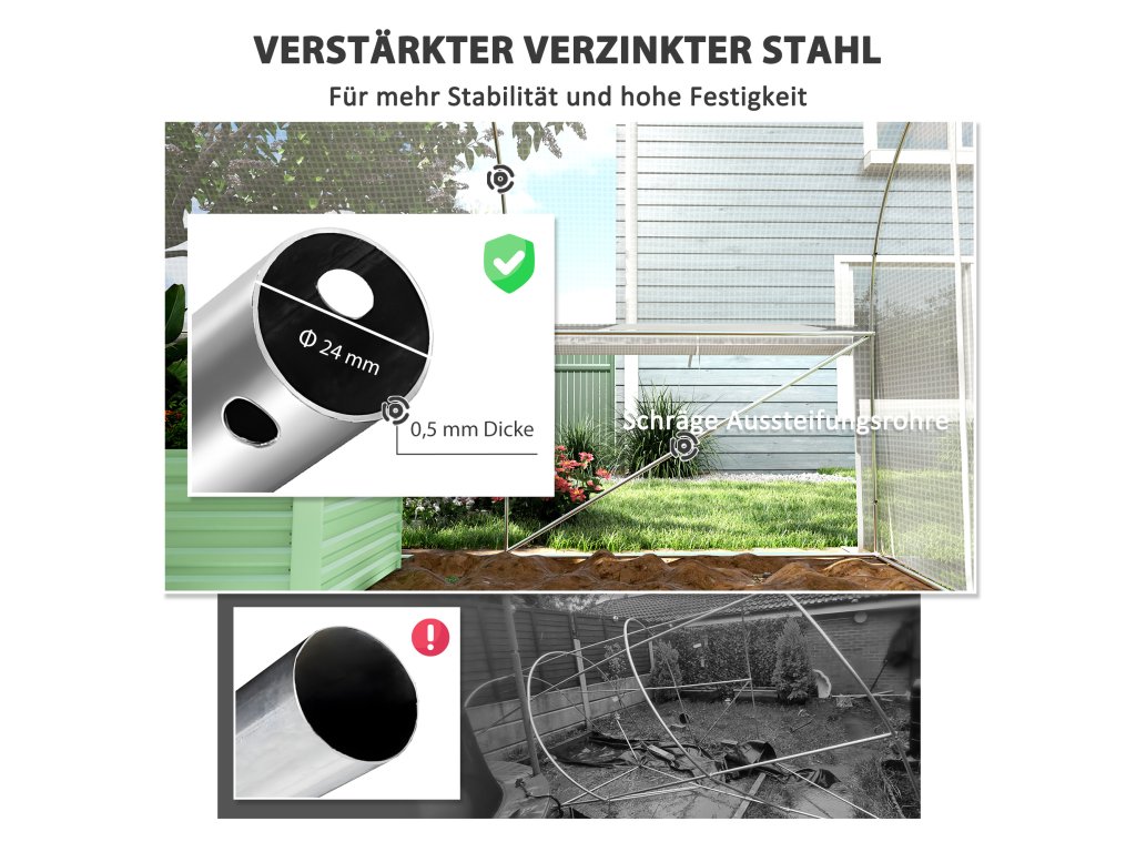 - Pevná konstrukce: Tento skleník je vybaven rámem z pozinkované oceli o tloušťce 24 mm, příčníky, zemními kůly a lany, které zaručují vysokou stabilitu