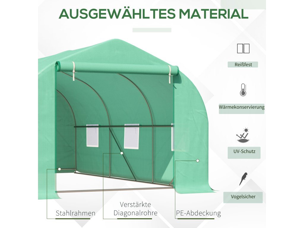 Náš robustní fóliový skleník od společnosti Outsunny lze v případě potřeby rychle a snadno postavit a po skončení pěstování zase rozebrat. Vaše rostliny jsou optimálně chráněny před chladem, deštěm, mrazem, větrem a intenzivním slunečním zářením.