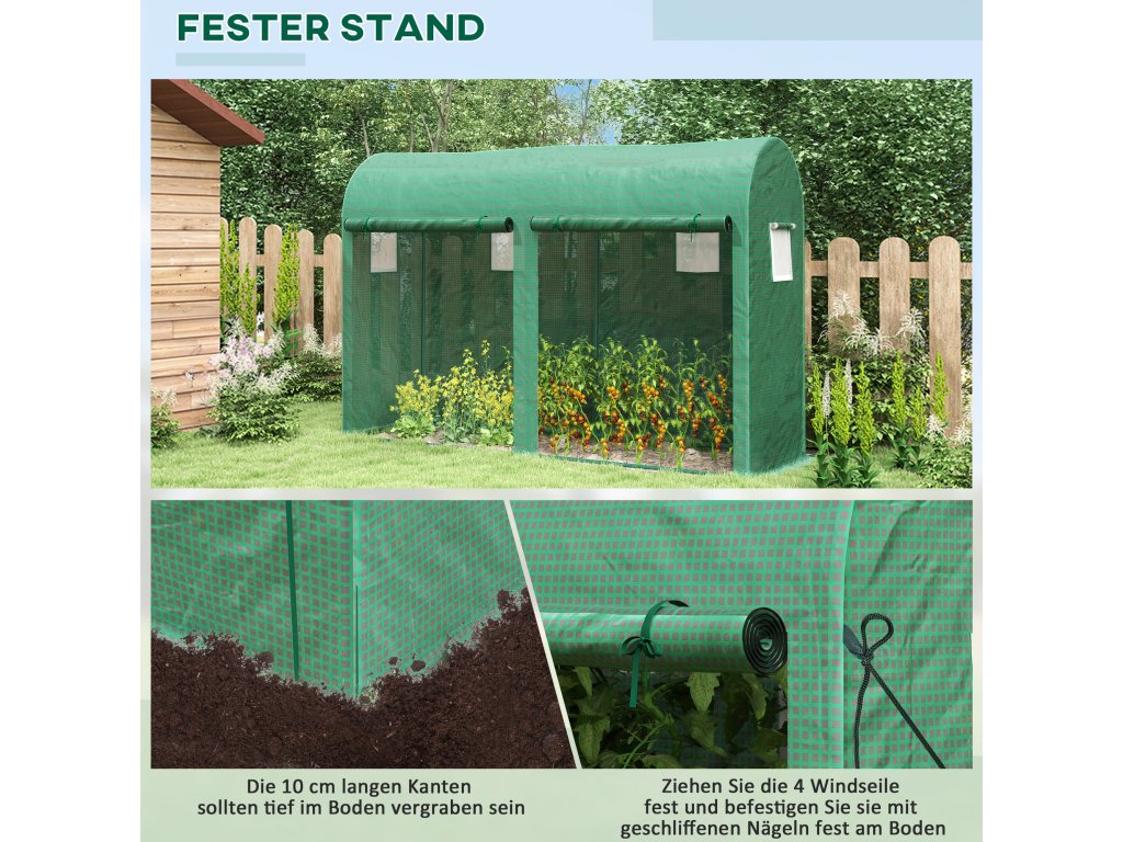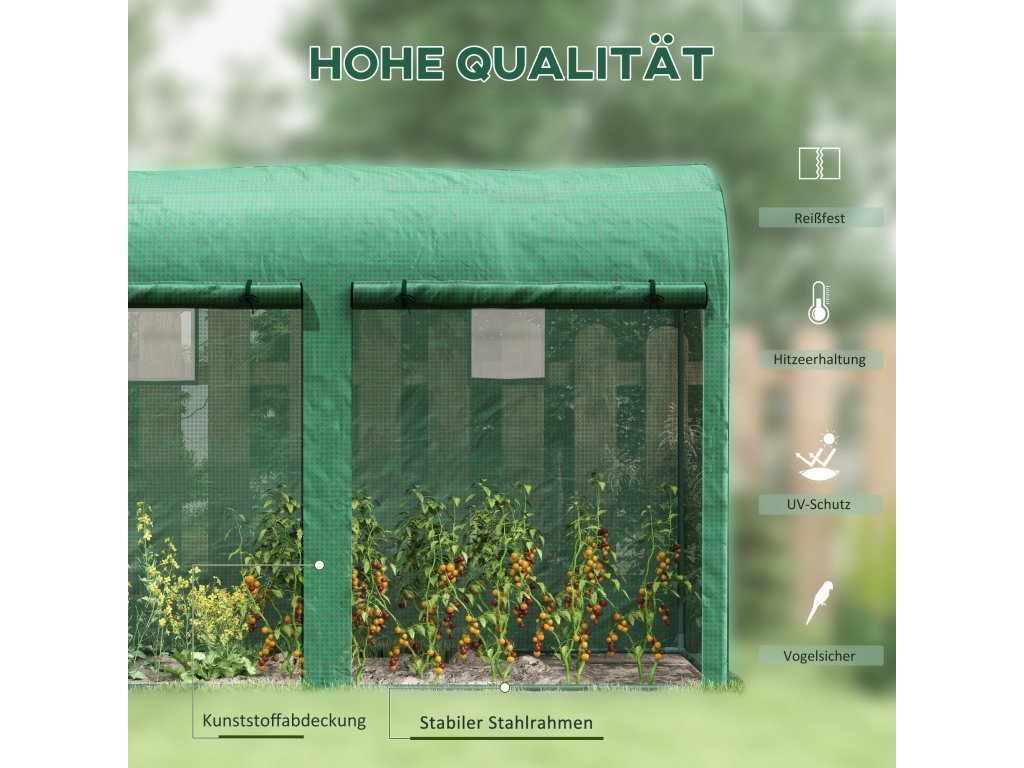 Náš skleník Outsunny je ideální volbou pro ty, kteří rádi zahradničí. Plastový kryt je chráněn před UV zářením, aby chránil rostliny před škodlivými paprsky. Odolný ocelový rám zajišťuje pevnost a stabilitu. Dvojité rolovací dveře a 4 okna zajišťují dobrou cirkulaci vzduchu a dostatek slunečního svitu, aby vaše rostliny zdravě rostly.