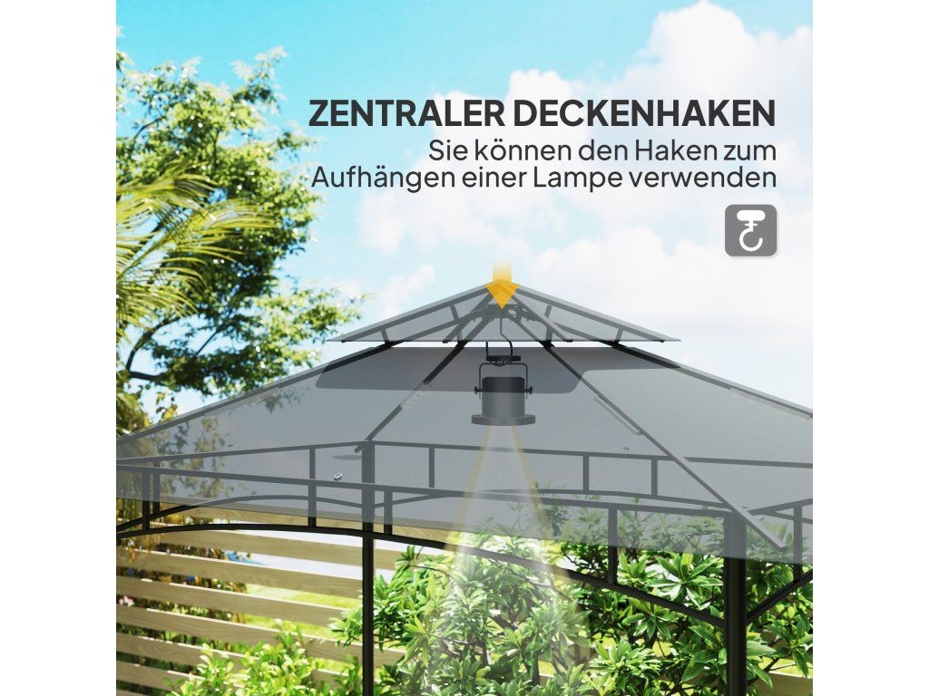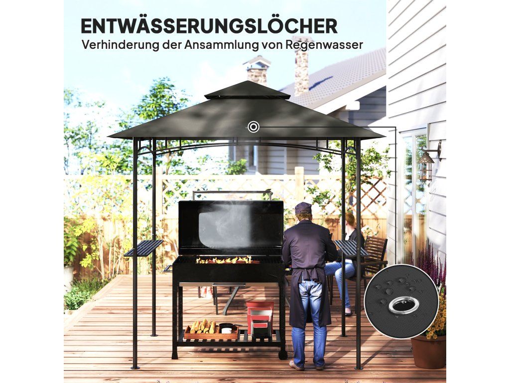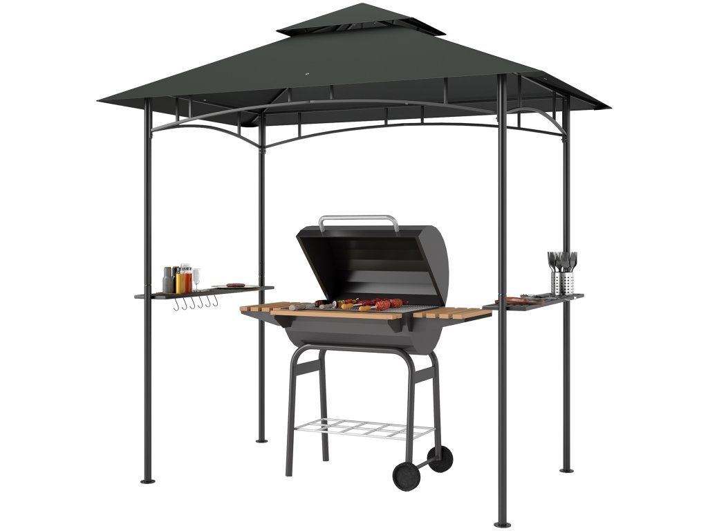 - Praktické možnosti skladování: Rozšiřte svůj grilovací prostor o dvě praktické boční police a robustní kovový koš, který je ideální pro uložení kuchyňského náčiní a koření. Vybavení těchto altánů šesti háčky a háčkem na stropě nabízí snadné možnosti zavěšení grilovacího náčiní.