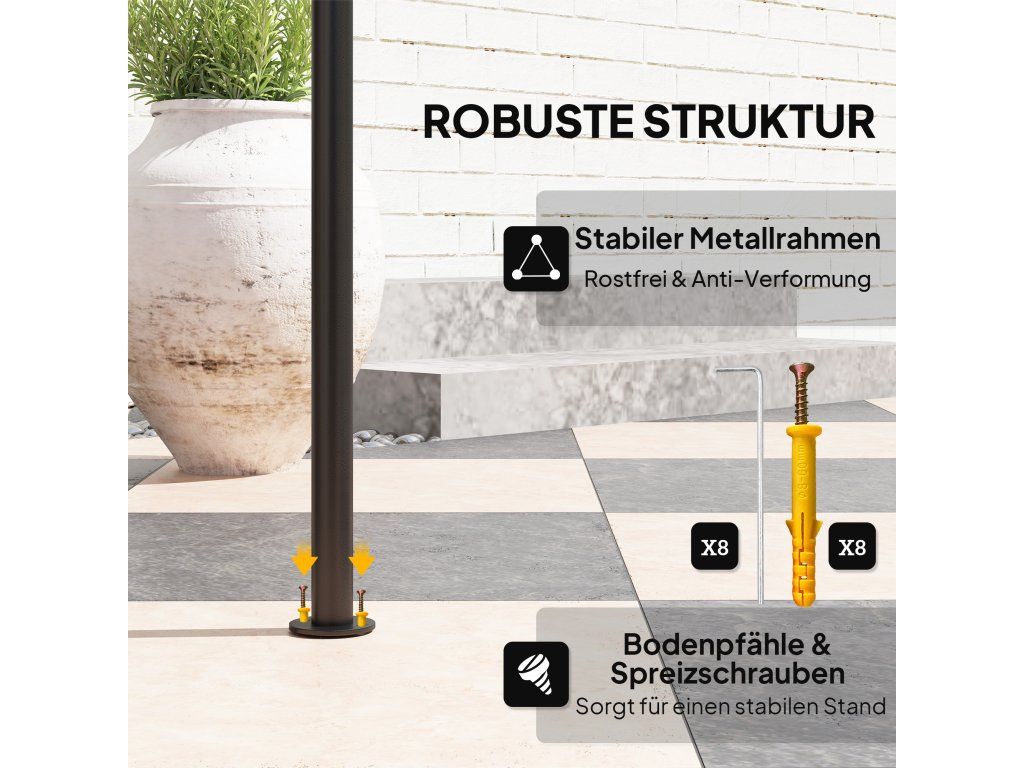 - Stabilní a bezpečný: Tento grilovací altán je vyroben z práškově lakované oceli a je odolný proti korozi a korozi, takže je ideální pro venkovní použití. Dodávané zemní kolíky a rozpěrné šrouby zajišťují vyšší stabilitu.
