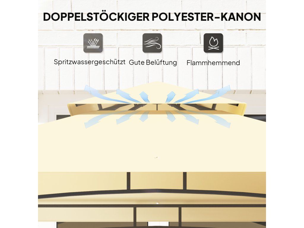 - Dvouvrstvá stříška: Náš grilovací altán je vybaven inovativní dvouvrstvou stříškou, která byla speciálně vyvinuta pro optimalizaci cirkulace vzduchu a účinný odvod tepla a kouře. Vrchní část s povrchovou úpravou, včetně čtyř odtokových otvorů, zajišťuje nehořlavost a ochranu proti stříkající vodě.