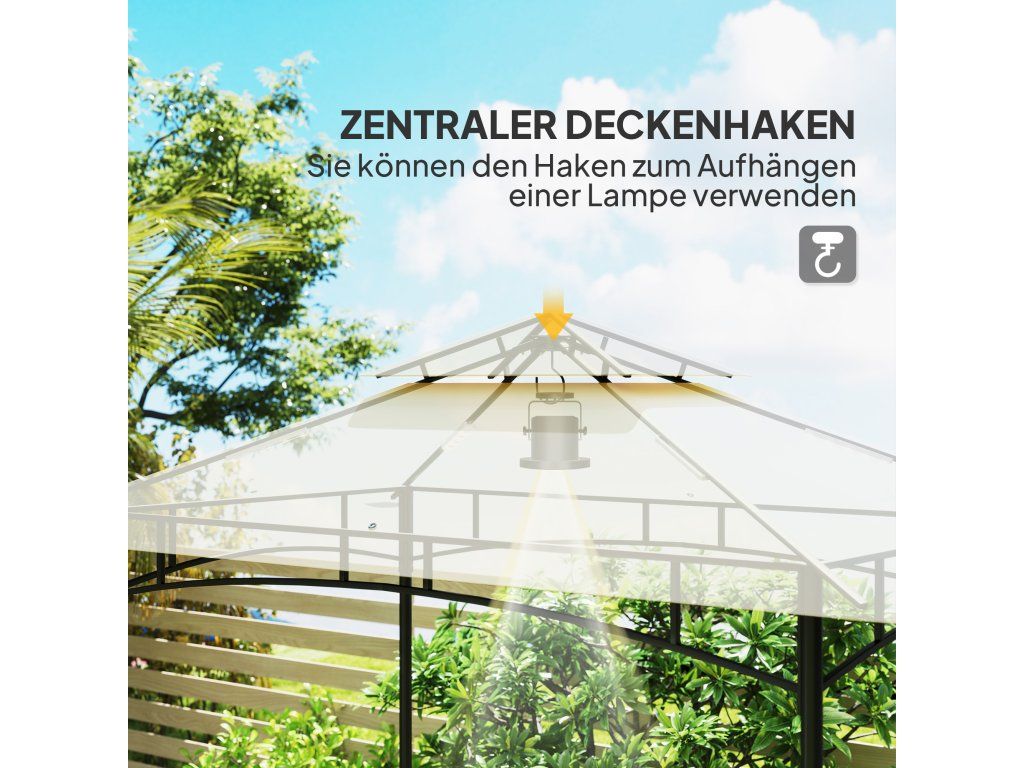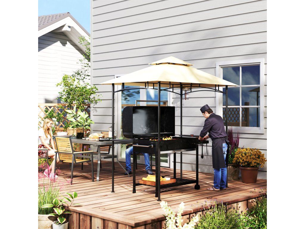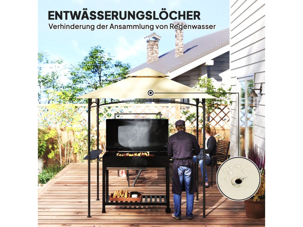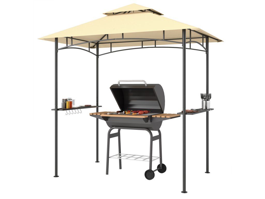 - Praktické možnosti skladování: Rozšiřte svůj grilovací prostor o dvě praktické boční police a robustní kovový koš, který je ideální pro uložení kuchyňského náčiní a koření. Vybavení těchto altánů šesti háčky a háčkem na stropě nabízí snadné možnosti zavěšení grilovacího náčiní.