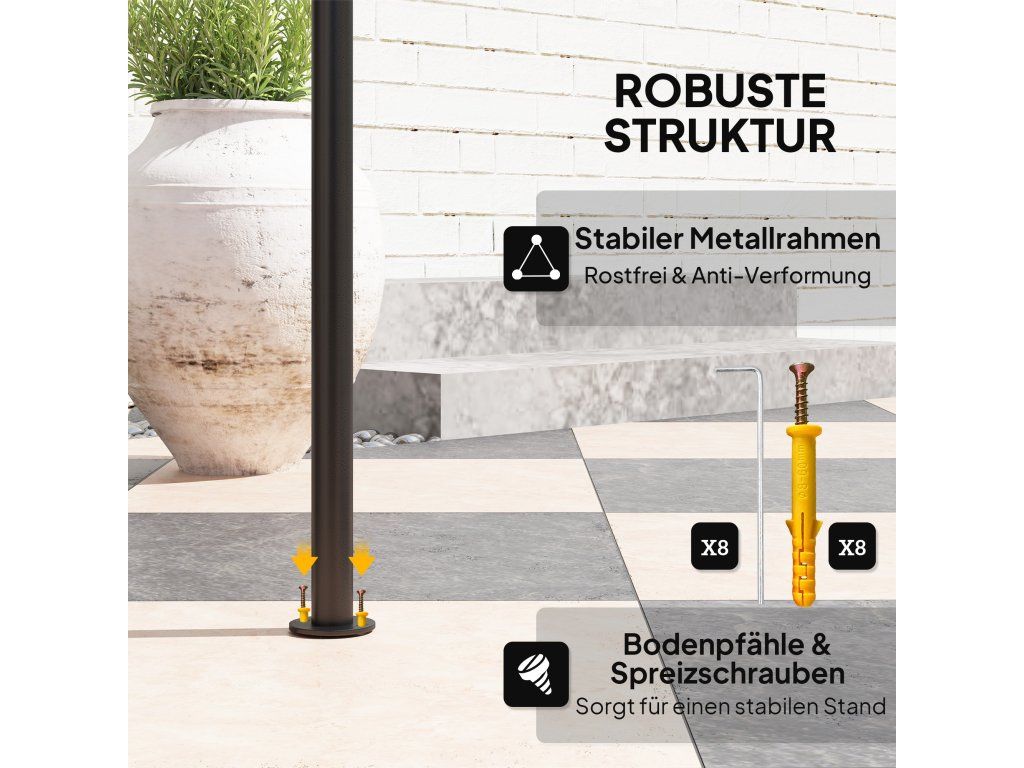 - Praktické osvětlení je součástí dodávky: Čtyři magnetická LED světla na pergole lze flexibilně umístit a zajistit tak optimální osvětlení ve večerních hodinách. Zapínání a vypínání je snadné pomocí tlačítka (baterie nejsou součástí dodávky).