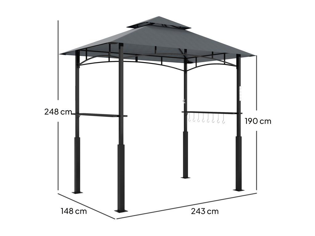 - Gesamtabmessungen: 243L x 148B x 248H cm. Belastbarkeit: 30 kg (Regal), 10 kg (Haken). Montage erforderlich. Hinweis: Dieser Gartenlauben ist für Grills bis zu einer Breite von 150 cm geeignet. Bitte überprüfen Sie die Maße vor dem Kauf