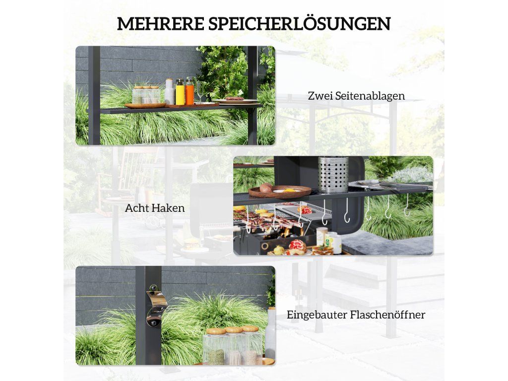 - Praktische Aufbewahrungslösungen: Mit zwei seitlichen Ablagen für Ihre Grillutensilien und 8 Haken für Werkzeuge ausgestattet, bietet dieser Grillpavillon zusätzlich einen integrierten Flaschenöffner