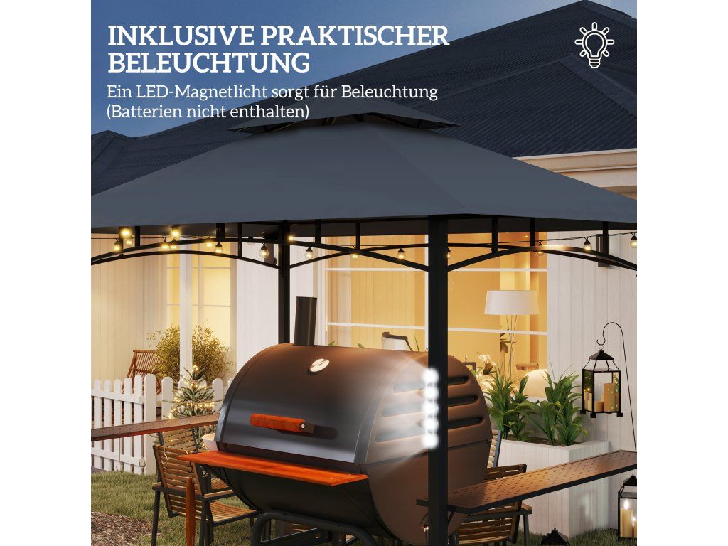 Das Doppel-Top-Design des [BRAND NAME] Grillpavillons sorgt für perfekte Luftzirkulation und das Kunststoff-beschichtete, feuerhemmende Vordach bietet mehr Sicherheit. Integrierte Regale und Haken des Gartenpavillons sorgen für praktische Aufbewahrungsmöglichkeiten und LED-Magnetlichter ermöglichen zudem ausreichend Beleuchtung für das Grillen am Abend. Holen Sie sich unser stabiles Grillzelt für Ihr ausgiebiges Gartenfest!
