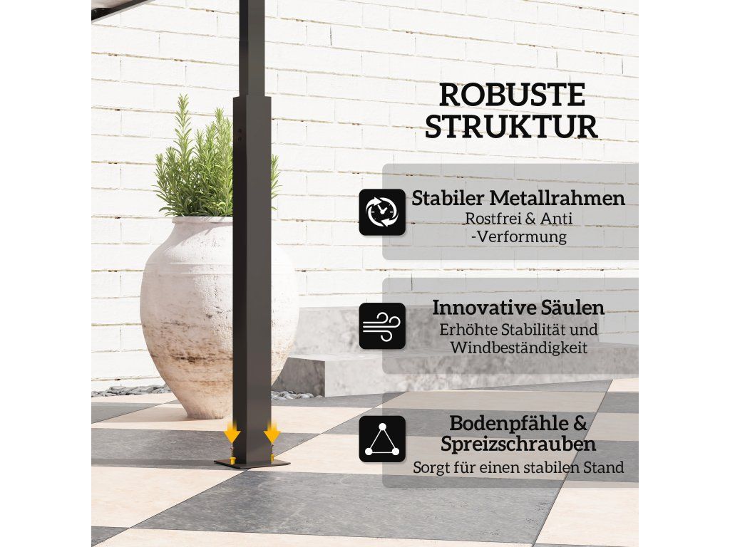- Robust und stabil: Dieses Gartenlauben verfügt über einen wetterfesten, pulverbeschichteten Metallrahmen und ein innovatives Säulendesign für mehr Stabilität, abgerundet mit Bodennägeln und Dübeln