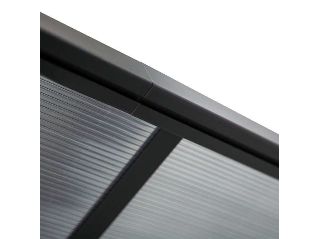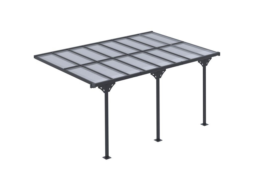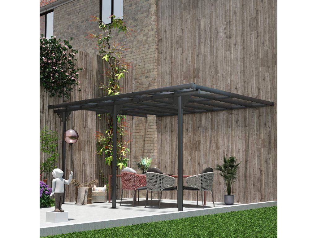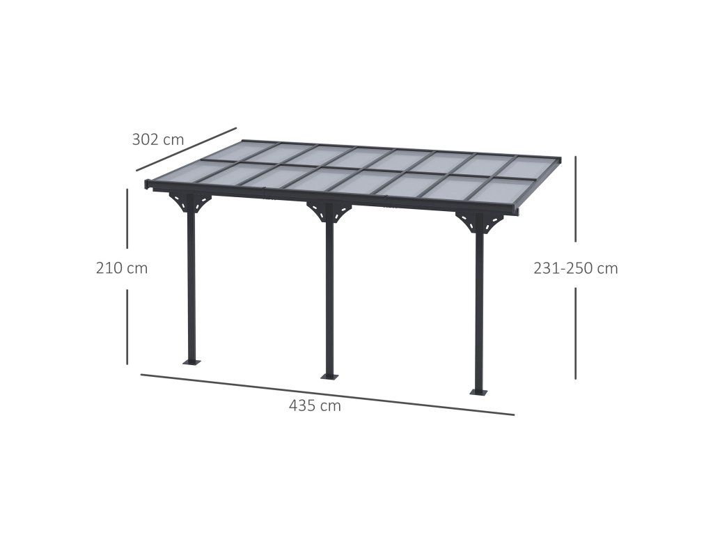 Hliníková pergola ke zdi 4,35 × 3,02 m, zastřešení terasy s polykarbonátovou střechou, výškově nastavitelná, šedá