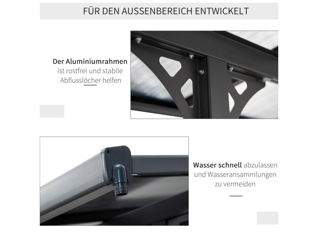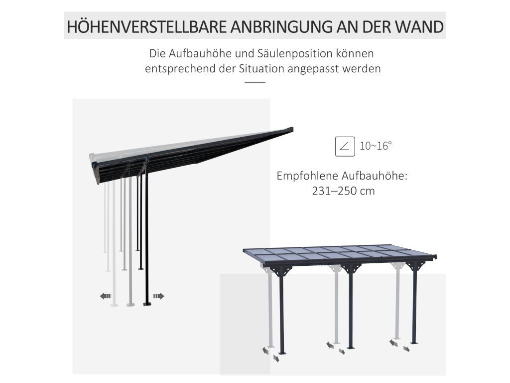 Vytvořte si příjemné a chráněné místo pro odpočinek na terase nebo zahradě s touto praktickou pergolou ke zdi. Střecha z odolného polykarbonátu propouští světlo a zároveň chrání před přímým sluncem i deštěm.Konstrukce z hliníku je lehká, pevná a odolná vůči korozi. Nastavitelná výška i poloha sloupků umožňují přizpůsobení různým prostorům a podmínkám. Integrovaný odtokový systém zajišťuje efektivní odvádění dešťové vody.