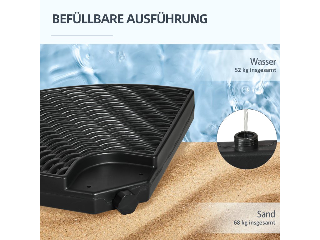 Hmotnost slunečníku Hmotnost slunečníku pro konzolový slunečník 52 kg voda nebo 68 kg písek odolný proti povětrnostním vlivům HDPE |