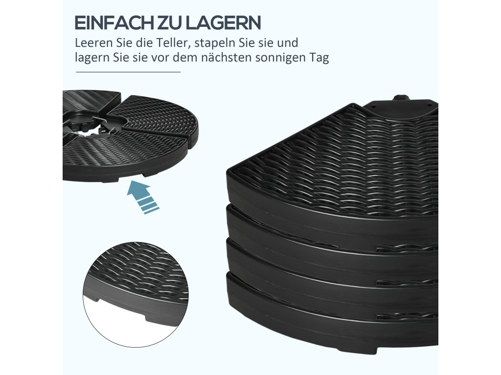 Udržujte své slunečníky Outsunny pevně na místě pomocí našich závaží pro konzolové stojany na slunečníky. Každý kus je vyroben z plastu HDPE, který je dostatečně odolný a robustní pro venkovní použití. Každý díl má plnicí otvor a šroubovací uzávěr, takže jej lze snadno naplnit vodou nebo pískem. Díky integrovaným držadlům se prázdné stojany na slunečníky snadno a pohodlně přepravují.