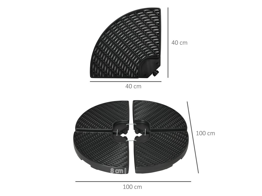 - Informace o závaží pro stojany na slunečníky s ratanovým vzhledem: Celkové rozměry: Ø100 x 8V cm. Jednotlivé desky: 40L x 40W x 8H cm. Předem se prosím změřte, abyste se ujistili, že naše závaží dobře sedí. Vhodné pro konzolové modely slunečníků Outsunny (čísla výrobků: 84D-187LG, 84D-187BU, 84D-161CG, 84D-161CF). Pro pomoc s identifikací příslušných produktových řad se prosím obraťte na náš zákaznický servis