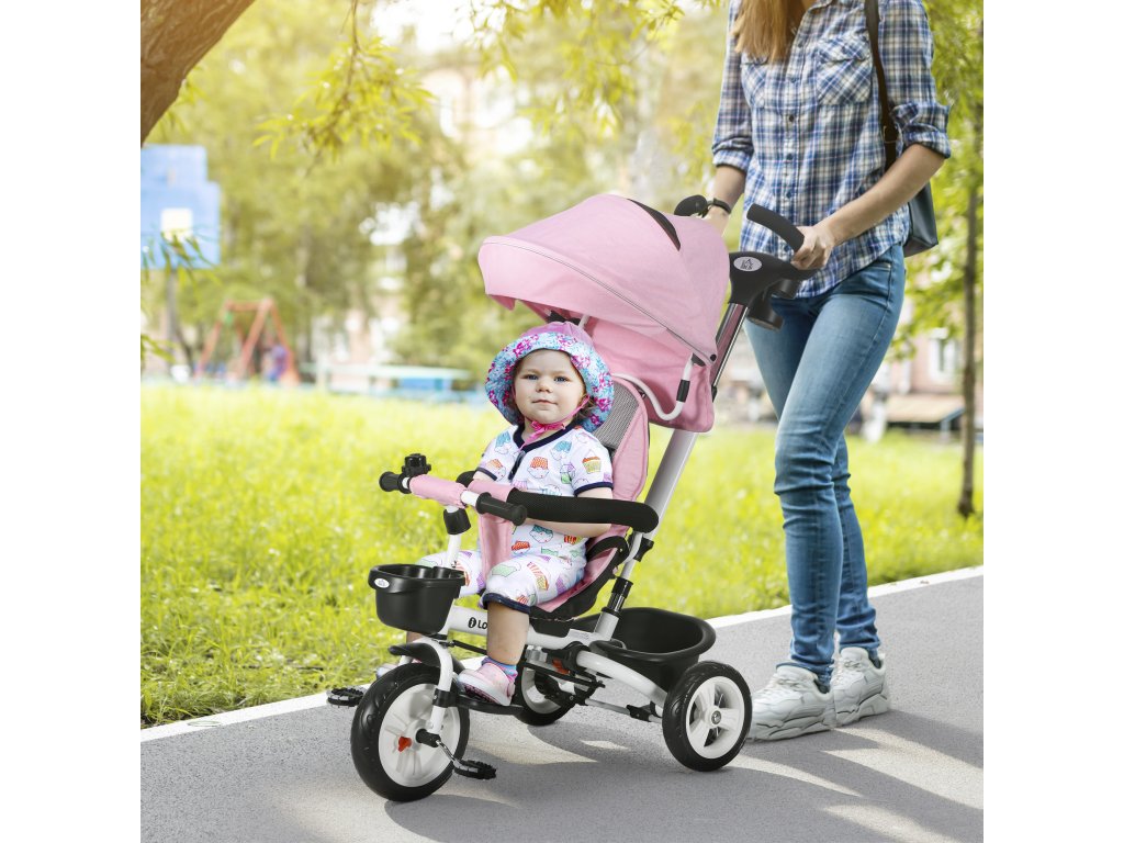 HOMCOM 2v1 tříkolka push bar dětská tříkolka bezpečnostní pás skládací sluneční stříška držák nápojů košík pedál 1-5 let růžová | Aosom