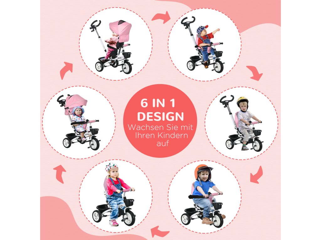 Objevte tuto důmyslnou dětskou tříkolku od společnosti HOMCOM! Díky čtyřem různým designům je ideální pro děti od 12 měsíců, aby se naučily jezdit a chodit. Ať už jako balanční kolo, nebo kolo s pádly, každé s rukojetí na tlačení nebo bez ní. Robustní kovový rám a bezpečné dvoubodové pásy poskytují větší bezpečnost. Tříkolka je spolehlivý společník, který roste s vaším dítětem a jemně ho podporuje při prvních pokusech o jízdu.