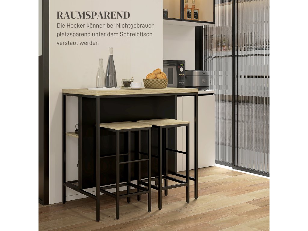 HOMCOM Barový set 3-dílný kuchyňský stůl se 2 barovými židlemi a 2 policemi, moderní jídelní set z oceli a dubu | Aosom.de