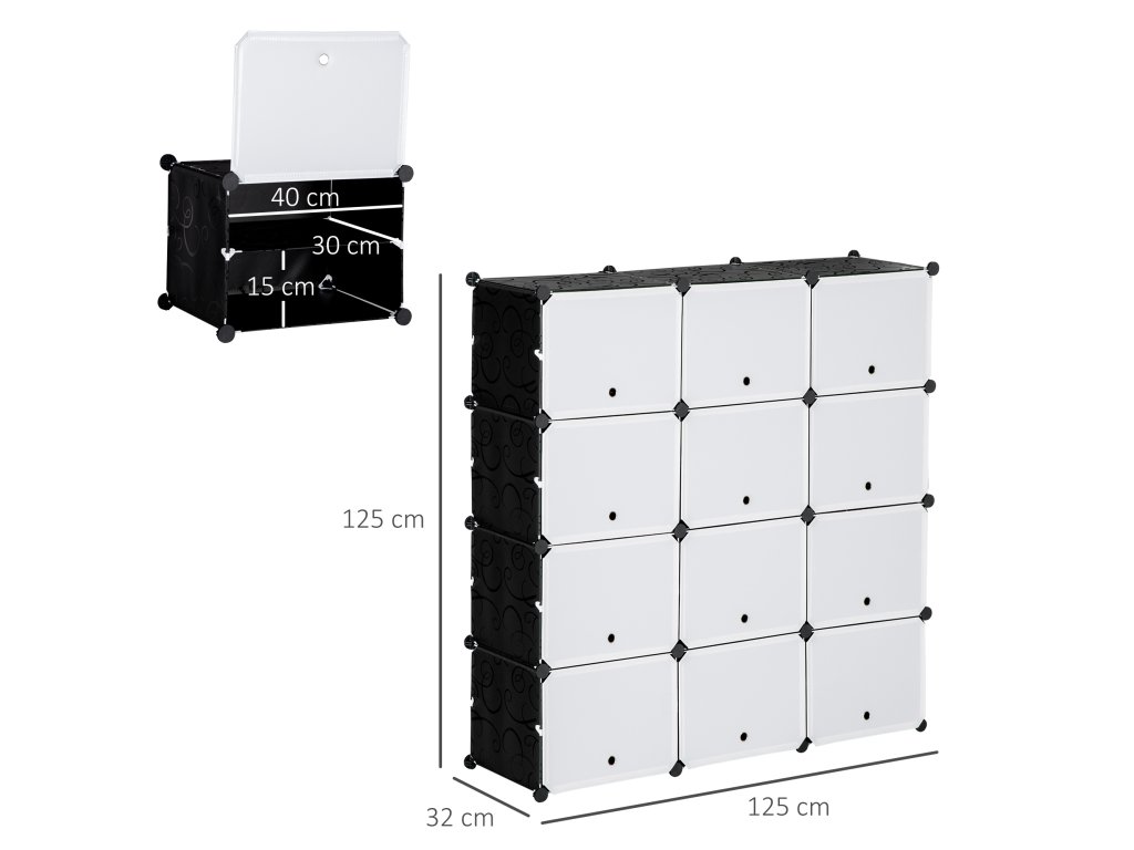 HOMCOM Botník Úložný box s 12 kostkami DIY zásuvný regál s dvířky Plastová ocel Černá+bílá 125 x 32 x 125 cm | Aosom