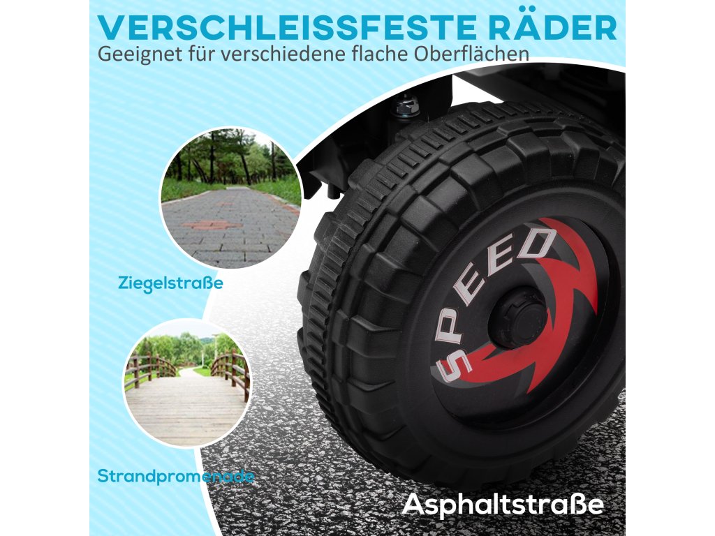 - Robustní kola: Kola odolná proti opotřebení zajišťují hladkou jízdu na různých površích a dělají z této dětské elektrické čtyřkolky ideální hračku pro venkovní použití