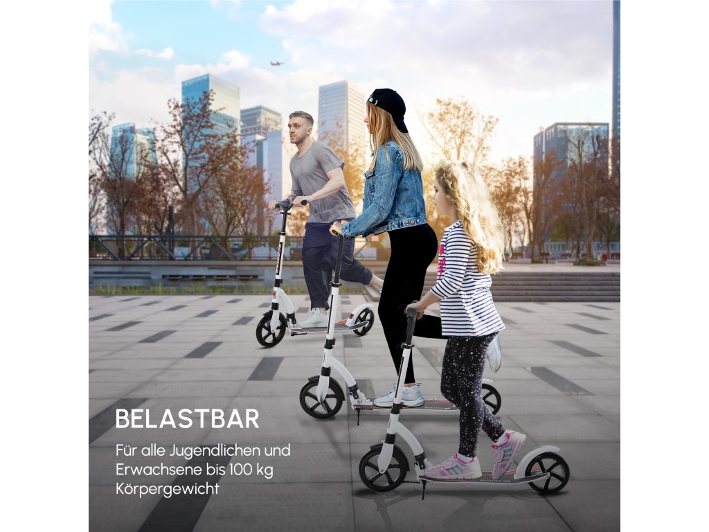 S touto moderní a bezpečnou skládací koloběžkou od společnosti HOMCOM bude vaše dítě zdolávat chodníky raz dva! Koloběžka je vybavena robustním hliníkovým rámem a snadno unese hmotnost až 100 kg. Výšku řídítek lze nastavit, takže tuto koloběžku mohou pohodlně používat jak dospívající, tak dospělí. Spolehlivý brzdový systém zadního kola a protiskluzové pneumatiky zajišťují bezpečnou a plynulou jízdu za všech okolností.