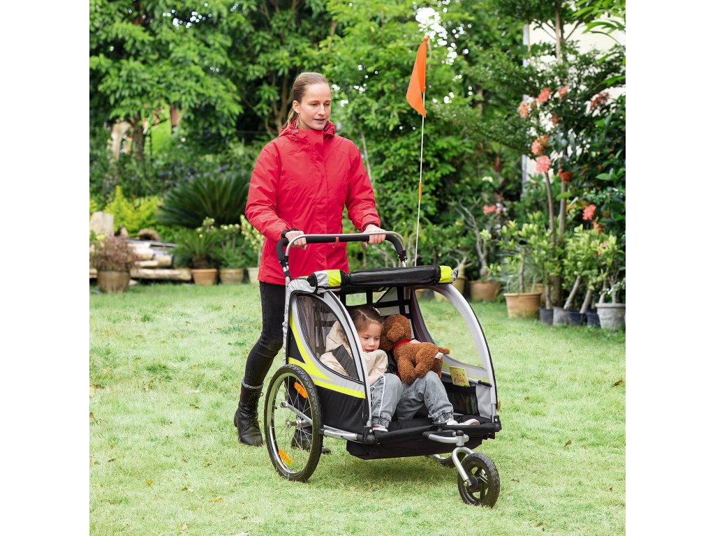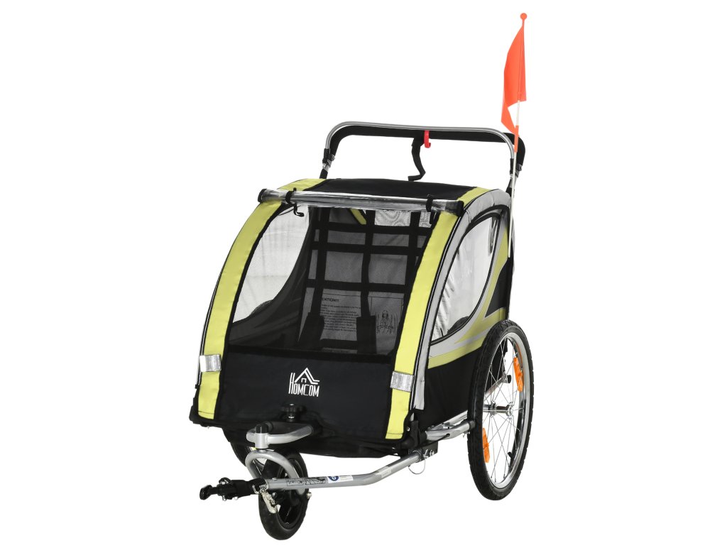 HOMCOM Dětský cyklistický přívěs 2 v 1 s odpružením, síťované dveře, přední kolo otočné o 360°, brzda, žlutá+černá, 142x75x101cm| Aosom
