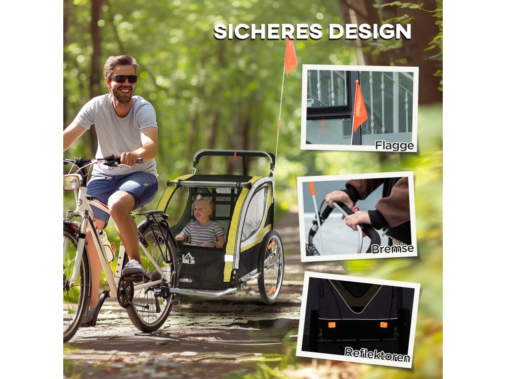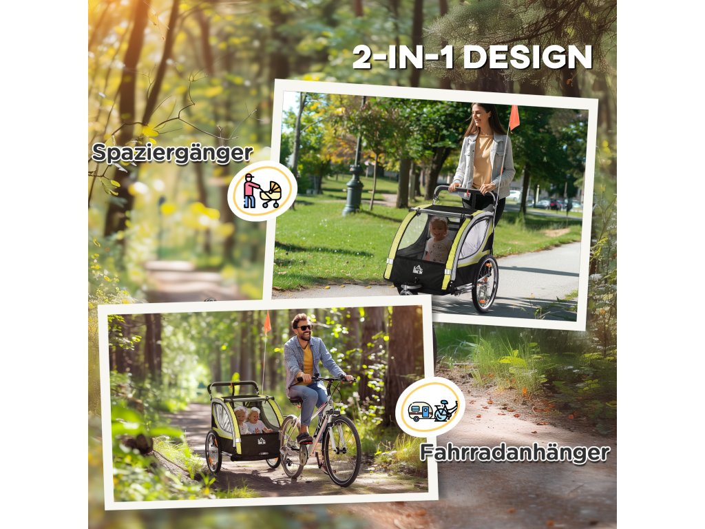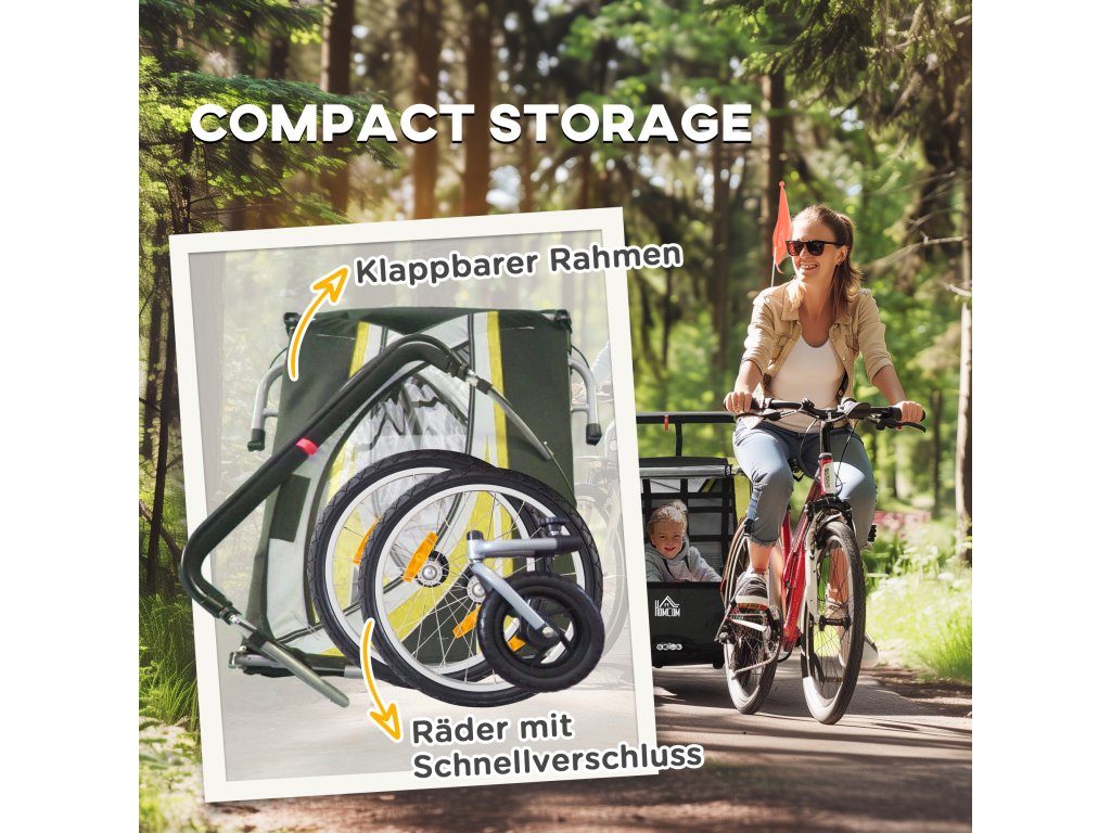 - přívěs 2 v 1: Dětský přívěs na kolo lze přestavěním předních kol použít jako kočárek. Díky rychloupínacím pákám na zadních kolech lze kola rychle odejmout a přívěs uložit do auta nebo do sklepa, čímž se ušetří místo. (Pro úplné složení je nutné demontovat kola, rukojeť kočárku a tažnou tyč).