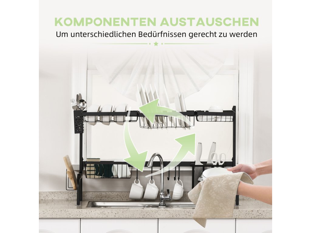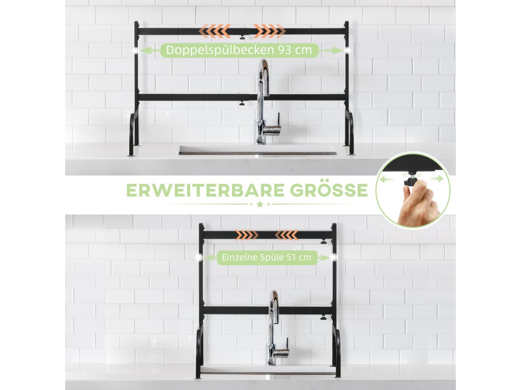 HOMCOM Dvoupatrový odkapávač na nádobí s háčkem a odkapávací plochou z oceli, černý 51-93 cm do kuchyně | Aosom.de