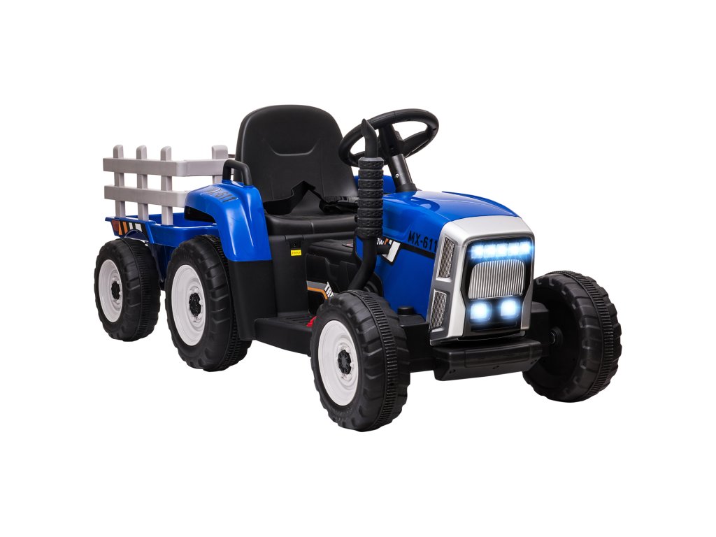 HOMCOM Elektrický dětský traktor s dálkovým ovládáním a přívěsem, MP3 světlomet, 3-6 km/h, pro děti od 3 do 6 let, modrý |