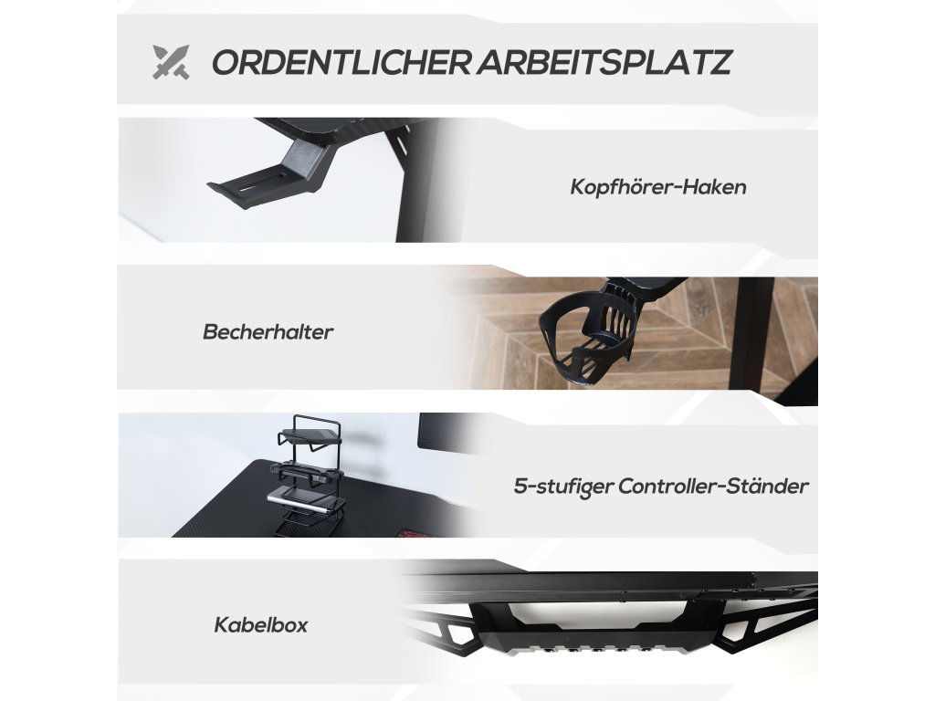 - INTELIGENTNÍ DESIGN: Tento herní stůl je vybaven držákem na šálky, háčkem na sluchátka, pětiúrovňovým stojanem na ovladače a pod deskou stolu se nachází organizér na kabely, který slouží k uspořádání všech kabelů a zařízení, navíc můžete měnit držák na šálky a háček na sluchátka podle svých zvyklostí.