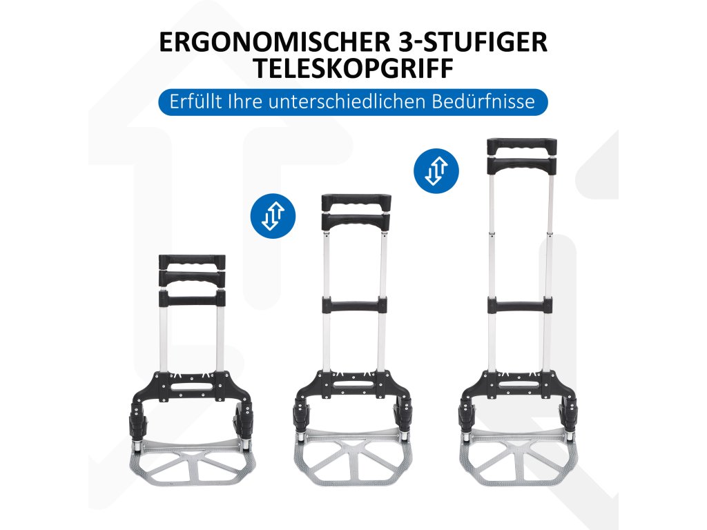 Náš vozík od společnosti HOMCOM vám usnadní přepravu zavazadel, balíků, přepravek na nápoje a dalších objemných předmětů. Jeho robustní hliníková konstrukce pojme přibližně 70 kg zboží. Je nejen skladný, ale také snadno skladovatelný, protože váží pouhé 3 kg. Je skládací a šetří místo, takže jej můžete pohodlně přenášet v ruce nebo v kufru auta. Díky třístupňovému výškovému nastavení rukojeti (100 cm, 90 cm a 60 cm) je vhodný pro naložené zboží různých velikostí.