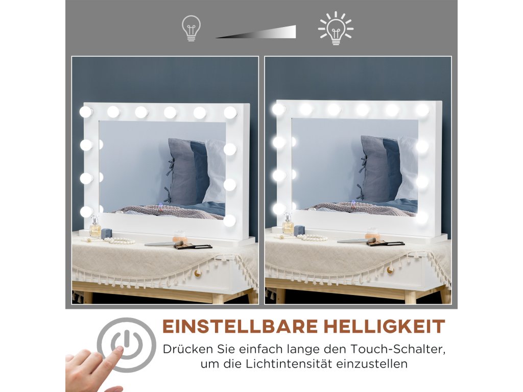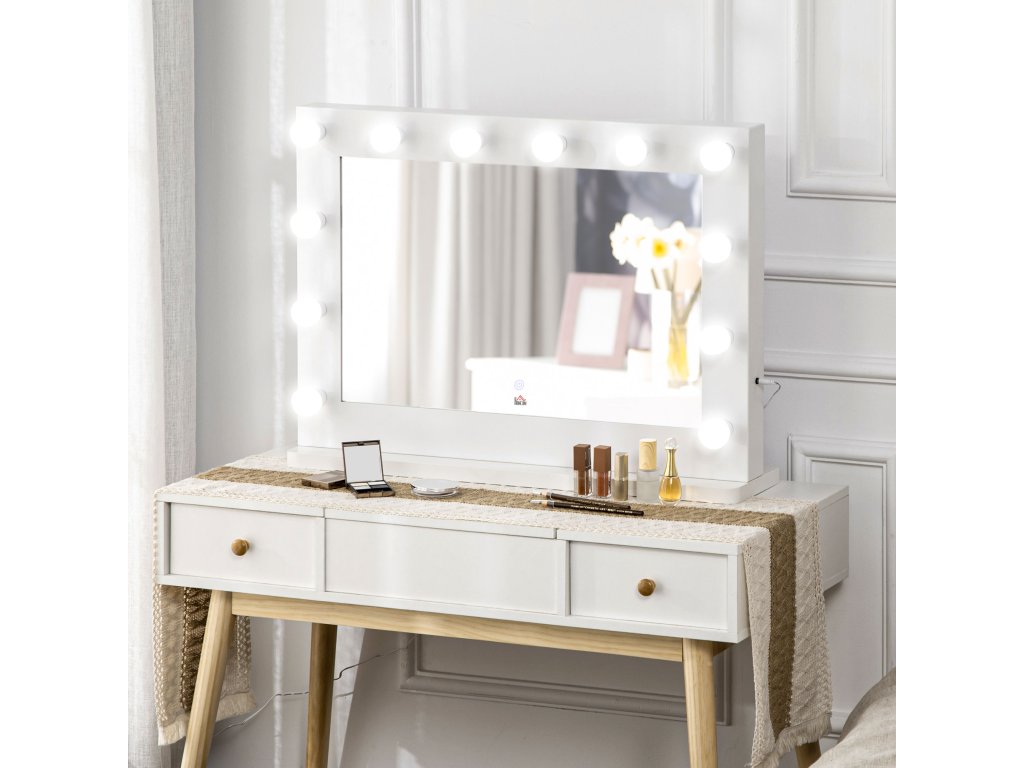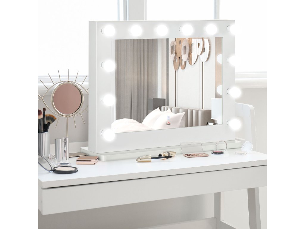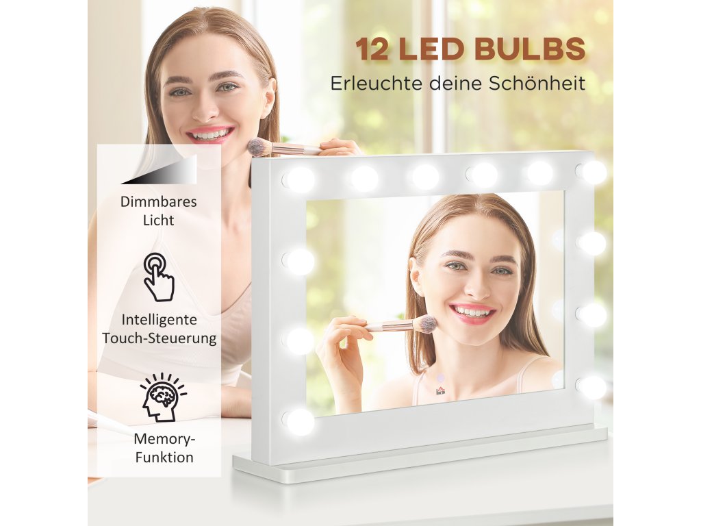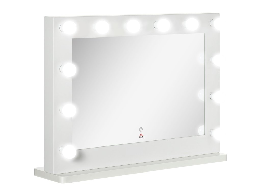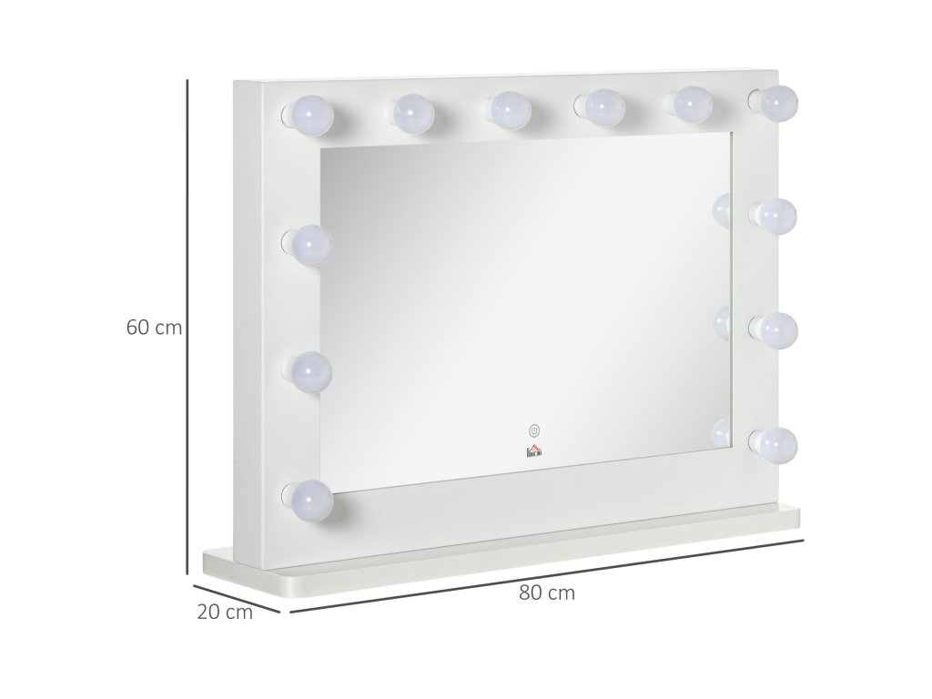 HOMCOM Hollywoodské zrcadlo s osvětlením, kosmetické zrcadlo s dotykovým spínačem, kosmetické zrcadlo s 12 stmívatelnými LED světly, 80 x 60 cm, kosmetické zrcadlo s paměťovou funkcí, bílé