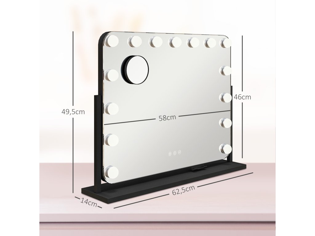 HOMCOM Hollywoodské zrcadlo s osvětlením 15 LED 62,5x49,5cm 3 režimy 10x zvětšení 360° otočné přenosné s držákem na mobilní telefon Černá | Aosom.de