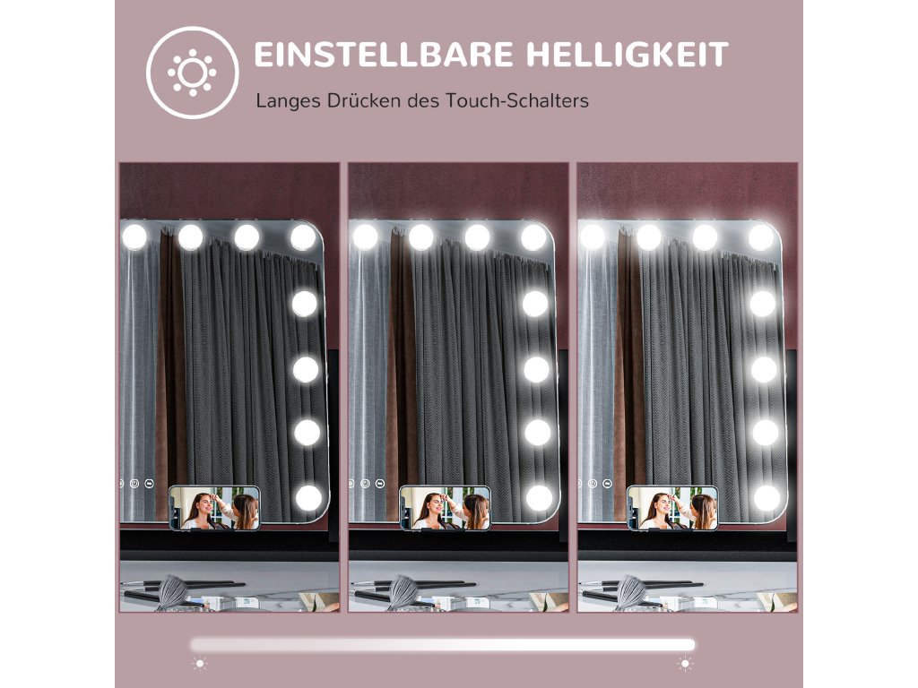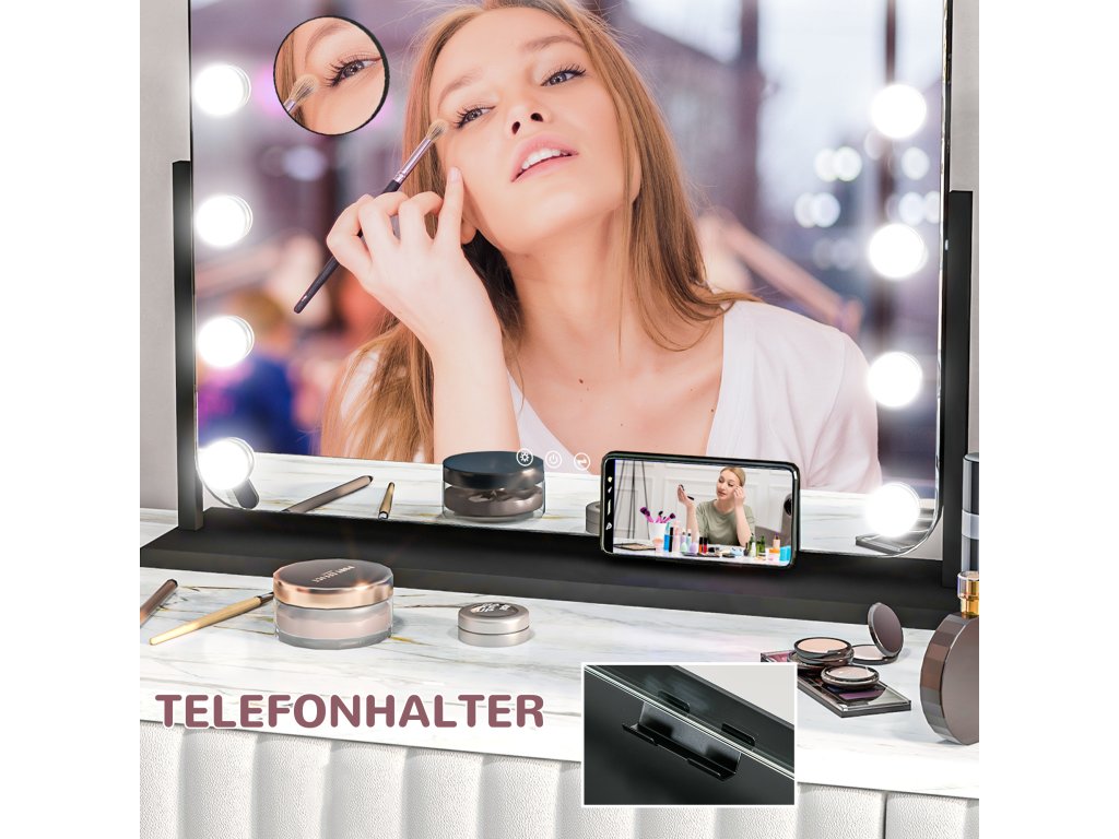 Ponořte se do moderního světa líčení se zrcadlem HOMCOM LED Hollywood. Je vybaveno 14 LED lampami, které svítí až 50 000 hodin, a držákem na mobilní telefon, takže se kosmetická rutina stane hračkou. Tři režimy osvětlení a nastavitelný jas zrcátka pro líčení vám zajistí ostrý, dokonale osvětlený obraz v zrcadle za každé světelné situace. Praktický USB port navíc zajišťuje, že můžete zároveň nabíjet svůj chytrý telefon.