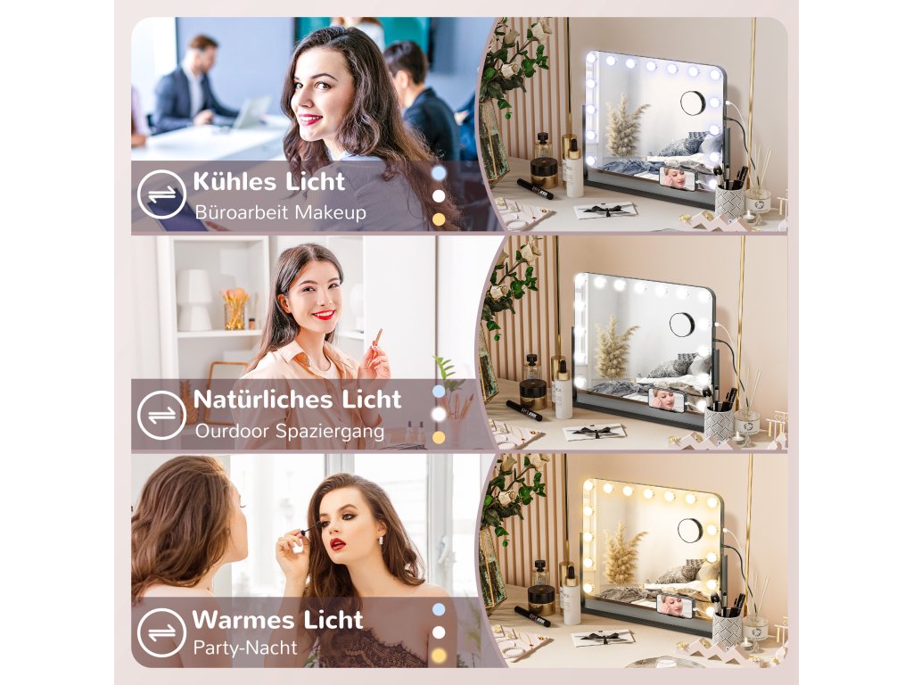 - Přizpůsobitelné osvětlení pro jakékoli prostředí: Zrcátko na líčení má tři barvy světla - teplou, studenou a přirozenou - a také nastavitelný jas, který lze ovládat jednoduše dotykem. Dokonale se přizpůsobí různým světelným podmínkám a požadavkům na líčení