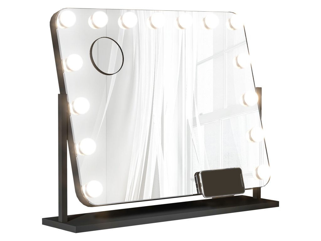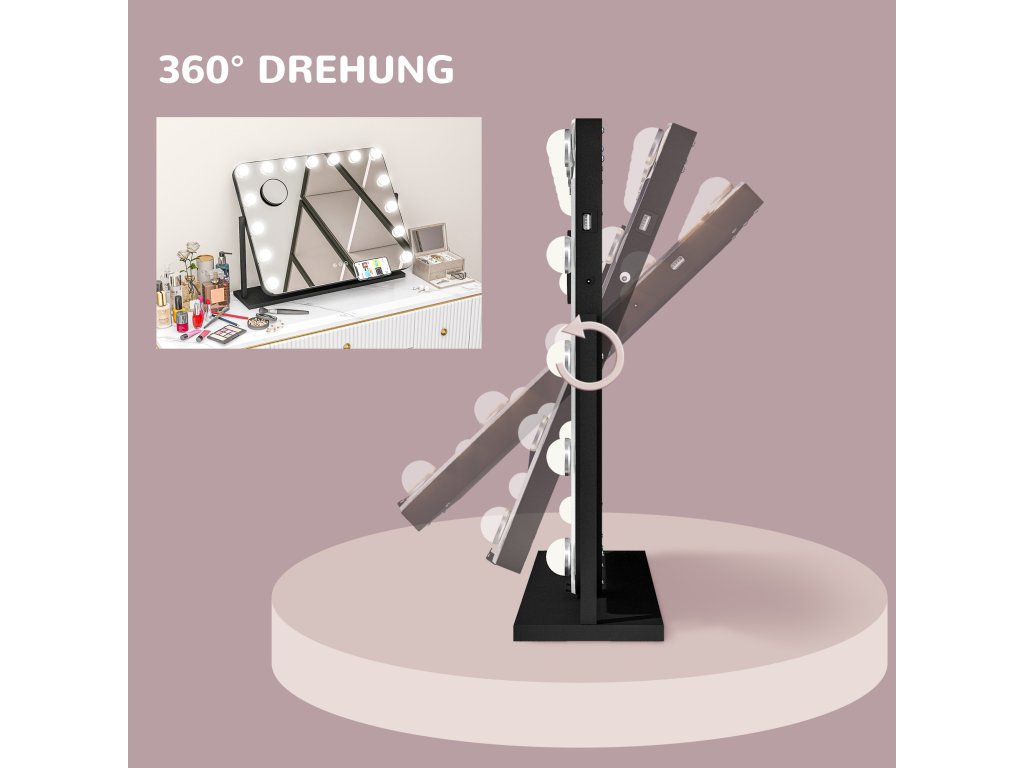 - otáčení o 360 stupňů: Velké zrcátko pro líčení lze snadno otočit do libovolného úhlu. Jeho kovový rám umožňuje stabilní umístění na jakoukoli plochu stolu