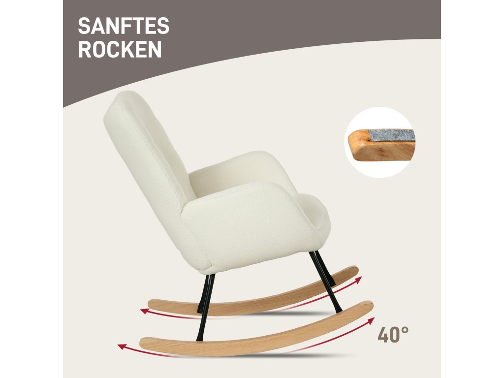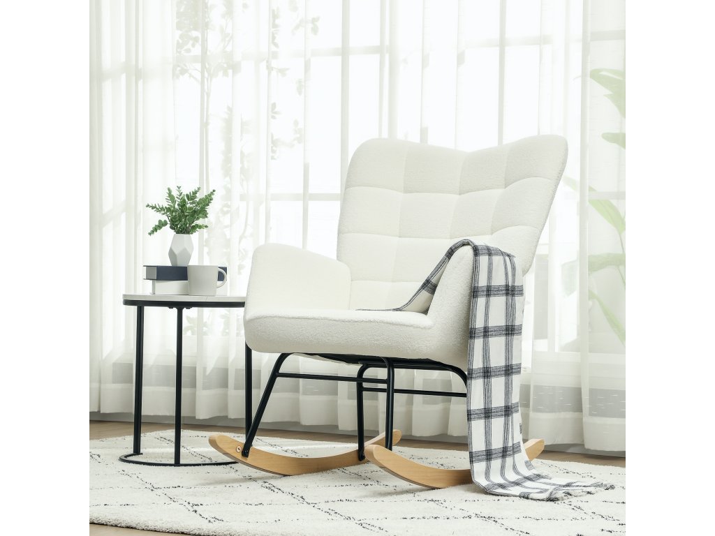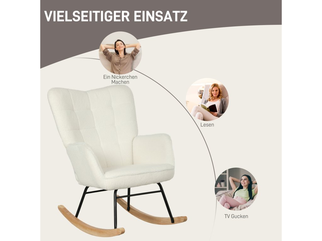 HOMCOM houpací křeslo, houpací křeslo se vzhledem berberského rouna, područky, čalouněné křeslo s dřevěnými podběhy, polohovací křeslo do obývacího pokoje, ložnice, max. nosnost 120 kg, bílé provedení