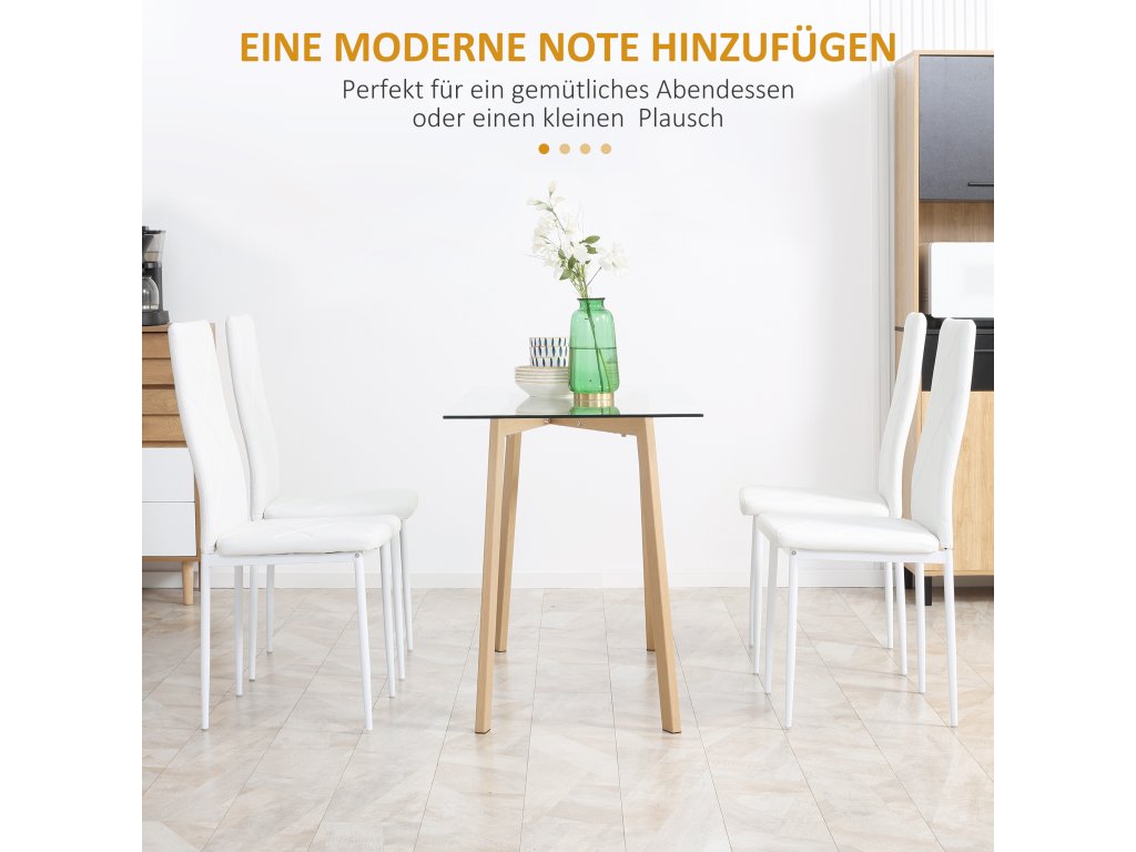 Vytvořte prostor pro každého z vašich hostů: sada kuchyňských židlí od společnosti HOMCOM se skládá ze 4 moderních židlí. Hodí se k různým stylům vybavení a do každé domácnosti. Vysoké opěradlo zajišťuje optimální oporu. Čalouněný sedák s potahem z imitace kůže nabízí maximální pohodlí. Díky ocelovému rámu jsou jídelní židle robustní a vhodné pro každodenní používání. Židle jsou vybaveny chrániči podlahy, které zabraňují poškrábání.