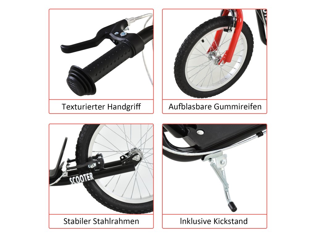 - Bezpečnostní brzdy: Díky duálnímu brzdnému systému pro přední a zadní kolo je pro malé děti snadné bezpečně zastavit nohou, zatímco ruční brzda vyžaduje větší sílu. Nízká plošina a velká kola zajišťují hladší jízdu.