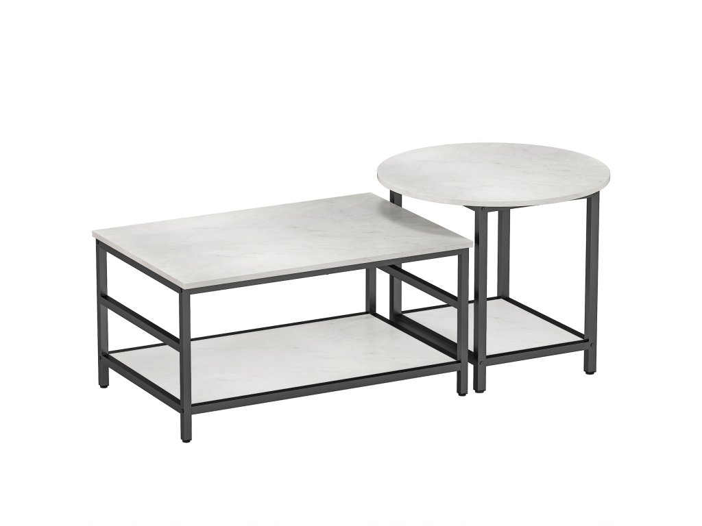- Sada dvou stolků: Tyto stylové konferenční stolky se skládají z obdélníkového a kulatého stolku, které lze používat samostatně nebo společně. Desky stolků v sofistikovaném mramorovém vzhledu a černý ocelový rám dodají elegantní nádech každé místnosti.