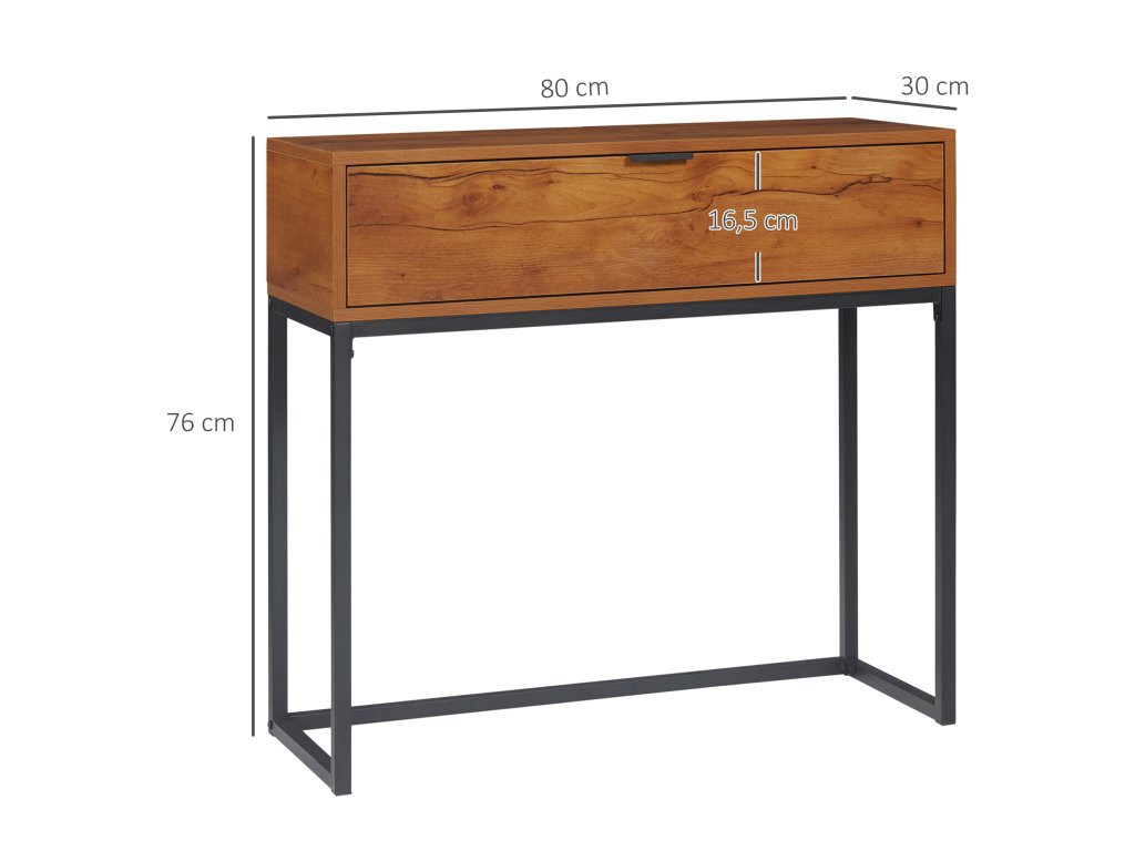 - Pevná konstrukce: Tento konzolový stolek se zásuvkou je vyroben z umělého dřeva a práškově lakovaného kovu a je robustní a vhodný pro každodenní použití.