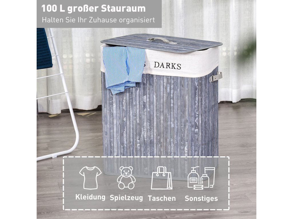 - Všestranné použití: Díky robustnímu bambusovému plášti má koš na prádlo rozměrově stabilní tělo. Spolu s víkem jej můžete flexibilně používat jako odkládací stolek nebo noční stolek. Díky úložnému prostoru o objemu 100 litrů je v něm také dostatek místa pro dětské hračky.