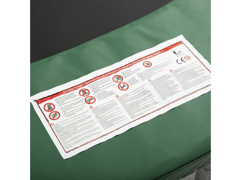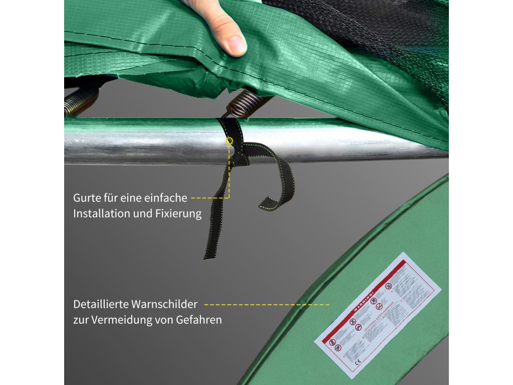 - Velký kryt okrajů: K dispozici v zelené barvě, nabízí nejlepší ochranu pro kulaté trampolíny o průměru Ø244 cm.
