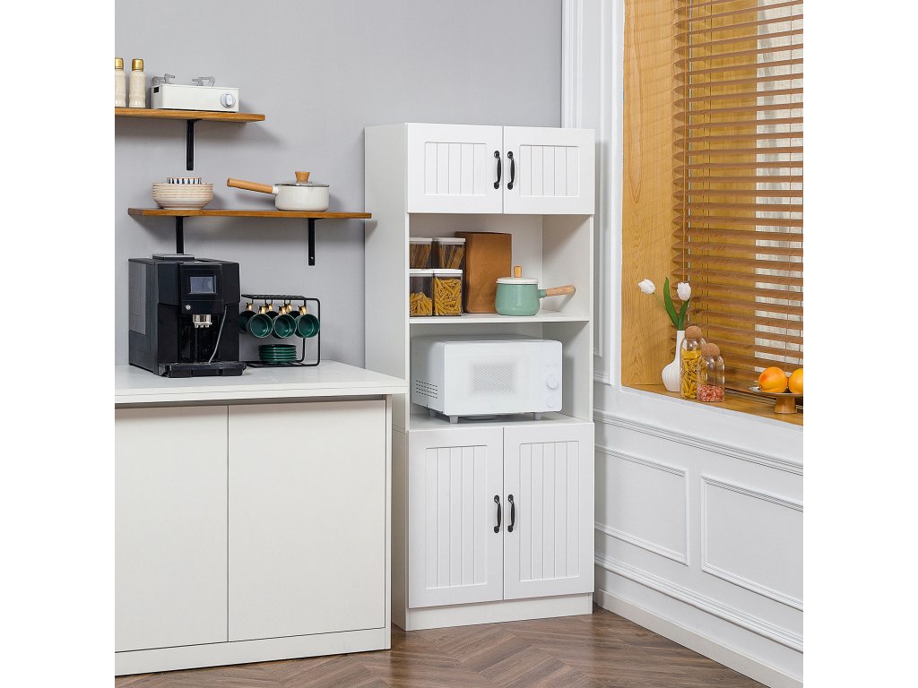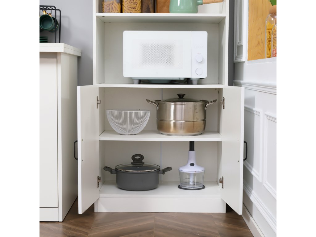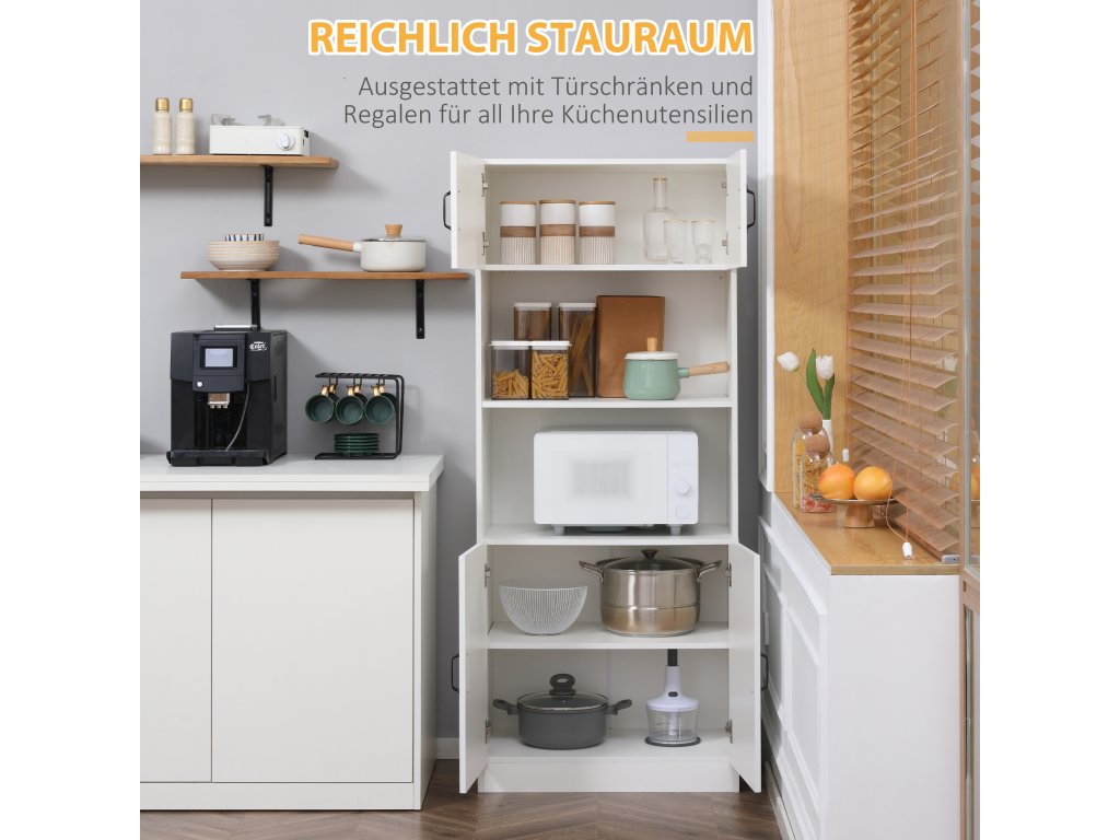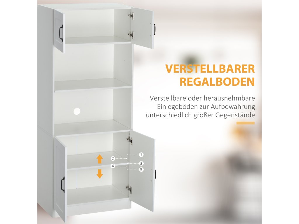 - Více úložného prostoru: 4 police této vysoké skříně nabízejí dostatek prostoru pro nádobí, hrnce, potraviny nebo plastové nádoby. Kuchyňské spotřebiče, jako je mikrovlnná trouba nebo kávovar, lze uložit do otevřeného středu. Za 4 dvířky je vše uspořádáno a obsah je chráněn před prachem. Pro větší předměty si můžete nastavitelné police ve spodní skříňce upravit podle svých potřeb.