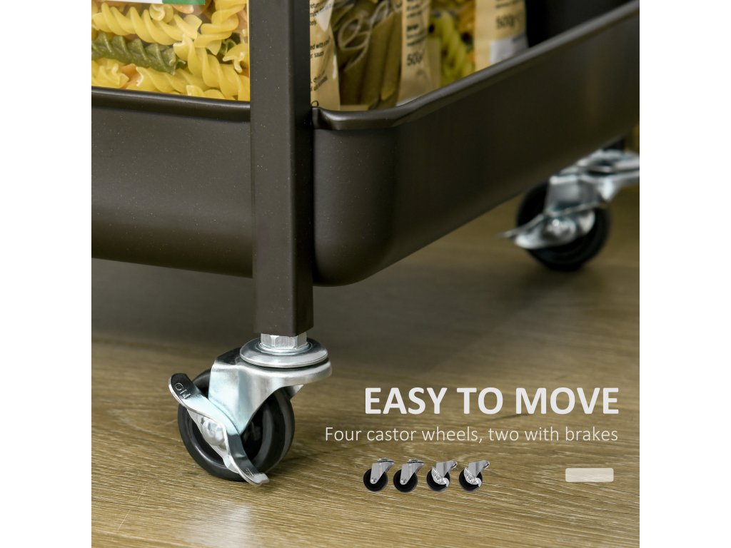 Tento kuchyňský vozík od společnosti HOMCOM zaujme nejen skvělým průmyslovým designem, ale také velkým úložným prostorem. V případě potřeby lze pracovní desku rozšířit o skládací stolek. Otevřená police nabízí dostatek úložného prostoru pro potraviny, nádobí a kuchyňské doplňky. Kuchyňský vozík se snadno pohybuje díky čtyřem kolečkům. Tento kuchyňský vozík od společnosti HOMCOM je ideálním pomocníkem do kuchyně.