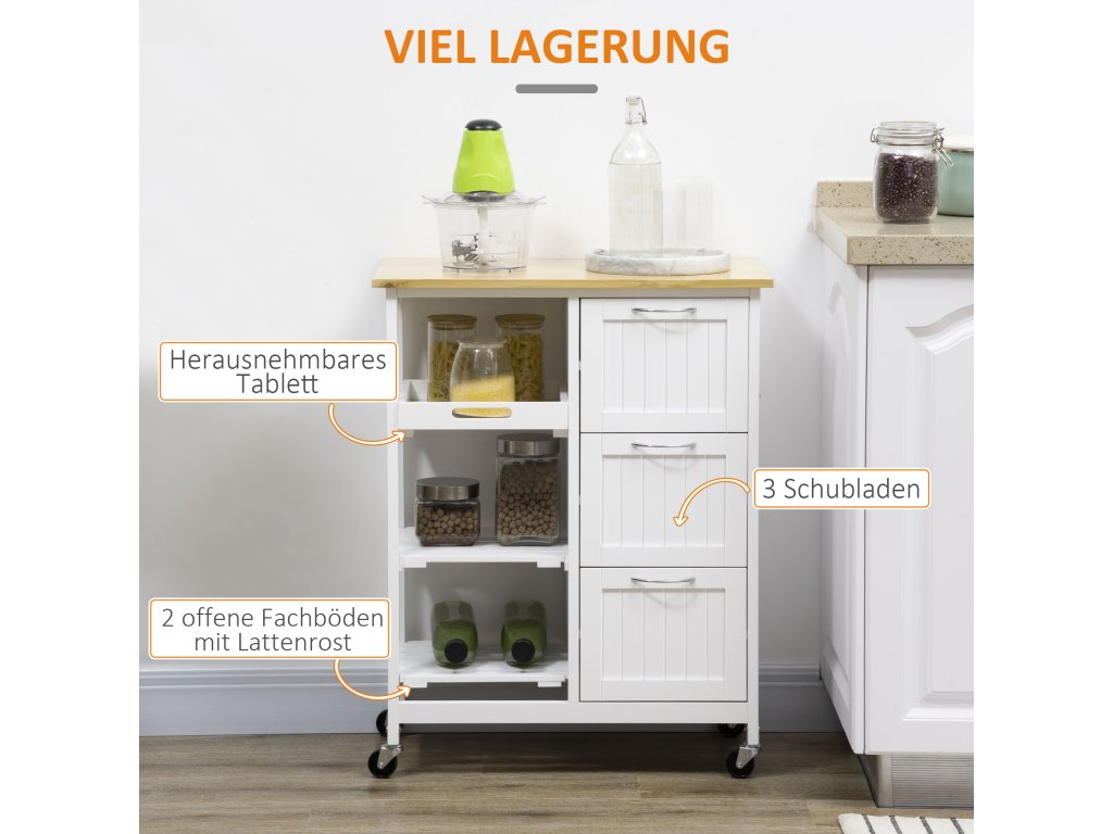 Uspořádejte si kuchyň pomocí tohoto stylového pojízdného úložného vozíku od společnosti HOMCOM. Rám z MDF je robustní a spolehlivý a je vhodný pro každodenní použití. Má tři výsuvné zásuvky, vyjímatelný tác a dvě otevřené police. Dřevěná stolová deska vám nabízí další prostor pro přípravu pokrmů. Kompaktní a funkční kuchyňský vozík, který by neměl chybět ve vaší domácnosti.