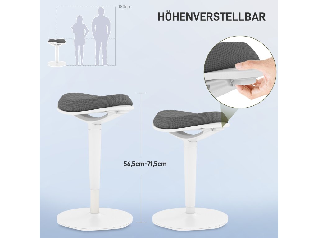 - Nastavitelná výška: Boční knoflíky usnadňují nastavení ideální výšky pro pracovní místa ve stoje. Tato kancelářská stolička je ideálním doplňkem dynamického pracovního prostředí a zajišťuje maximální pohodlí při práci ve stoje