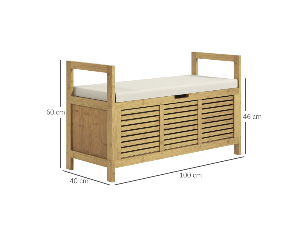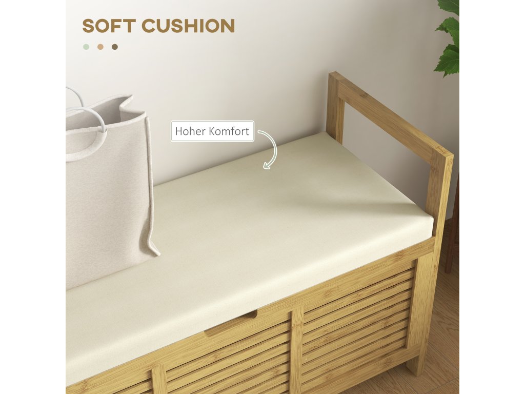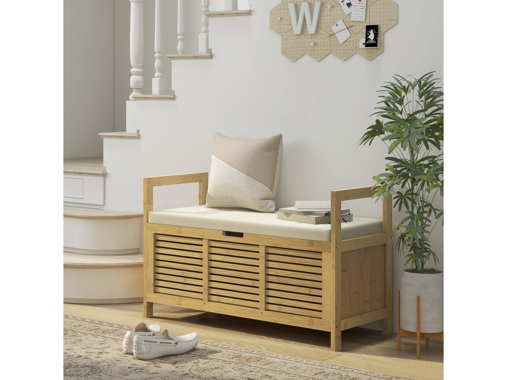 S naší bambusovou lavicí na boty HOMCOM si snadno uspořádáte vstupní prostor. Moderní vzhled se hodí do každého interiéru. Skrytý úložný prostor nabízí místo pro tašky, klobouky, klíče a mnoho dalšího, čímž vytvoříte větší organizaci ve vaší domácnosti. Polstrovaný sedák vám umožní pohodlně se posadit a obout si boty před odchodem z domu. Udělejte si pořádek v předsíni s naší víceúčelovou lavicí s úložným prostorem.
