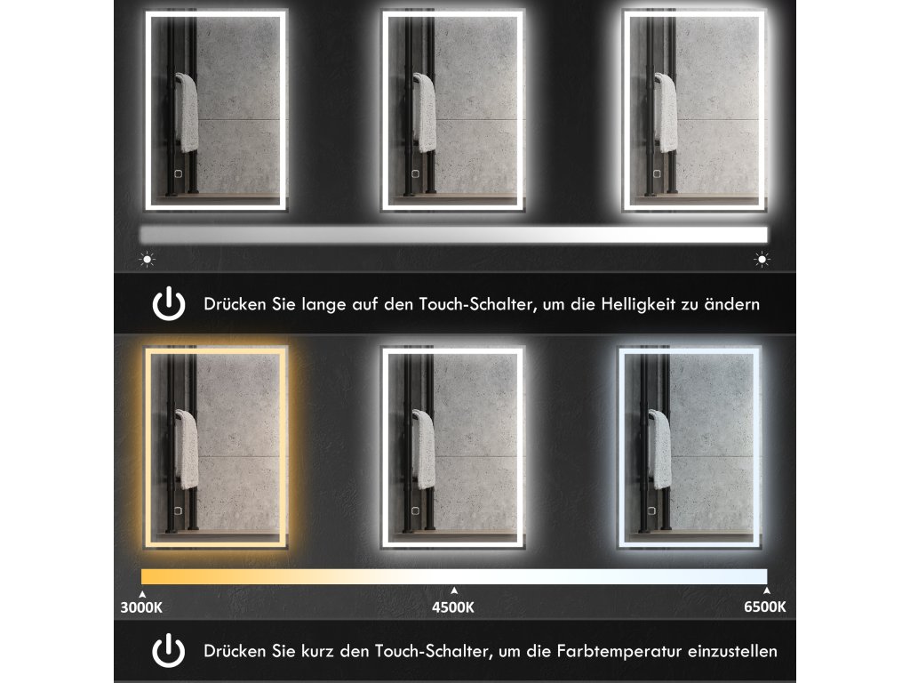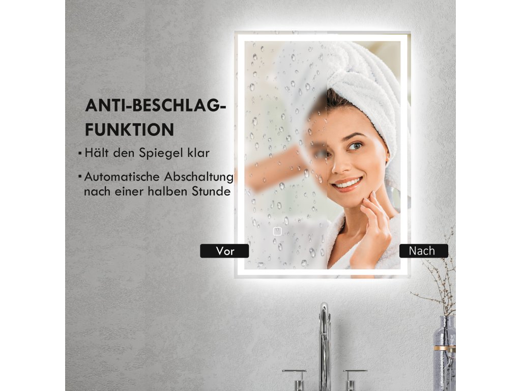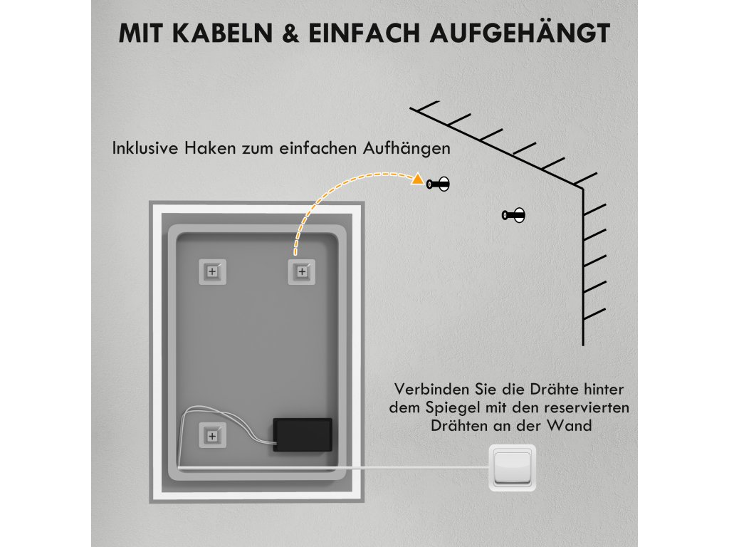 - Bezpečné: Koupelnové zrcadlo má stupeň vodotěsnosti IP44 (síťová přípojka) a IP44 (plastová zadní deska)