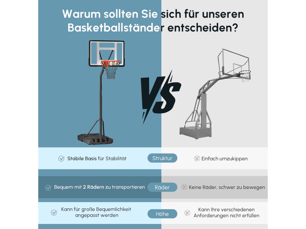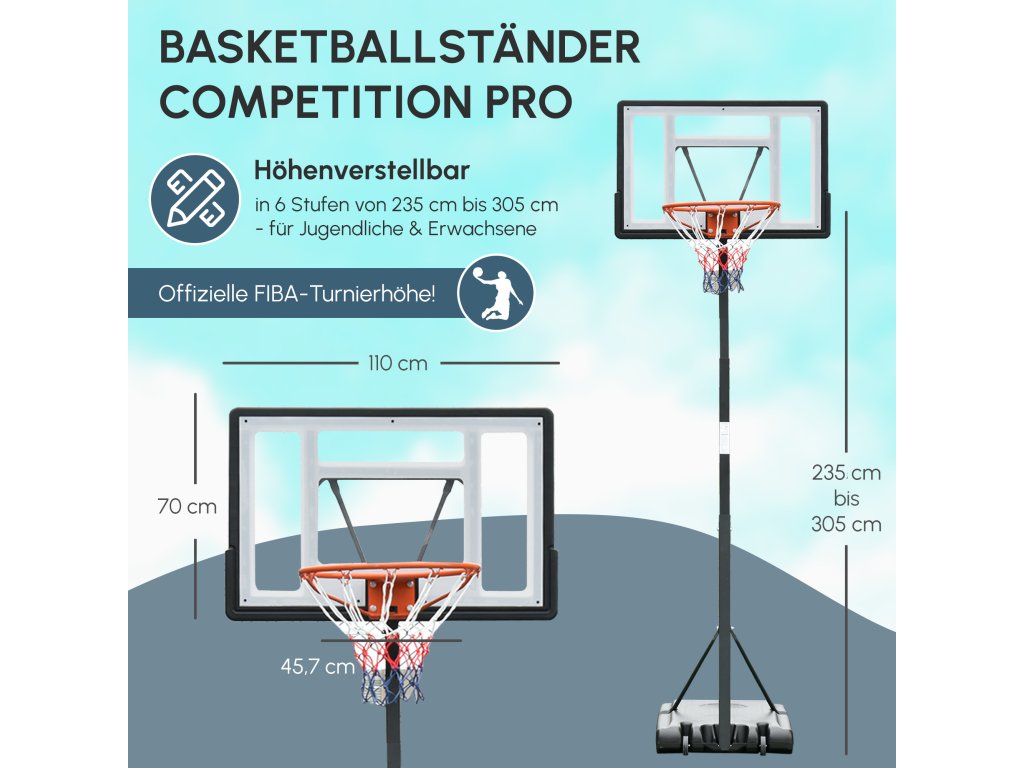 - Nastavitelná výška: Tento basketbalový stojan lze nastavit v rozmezí od 255 cm do 305 cm, aby vyhovoval uživatelům s různou výškou a požadavky. Ideální pro dospělé.
