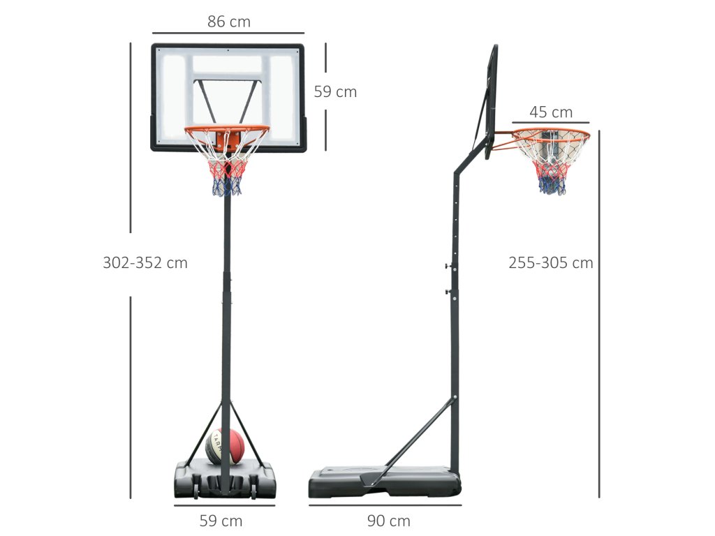 - Údaje o výrobku: Koš na basketbal je vhodný pro všechny hráče, kteří mají rádi basketbal: Celkové rozměry: 90Š x 165D x 302-352V cm, rozměry zadní desky: 86Š x 59V cm.