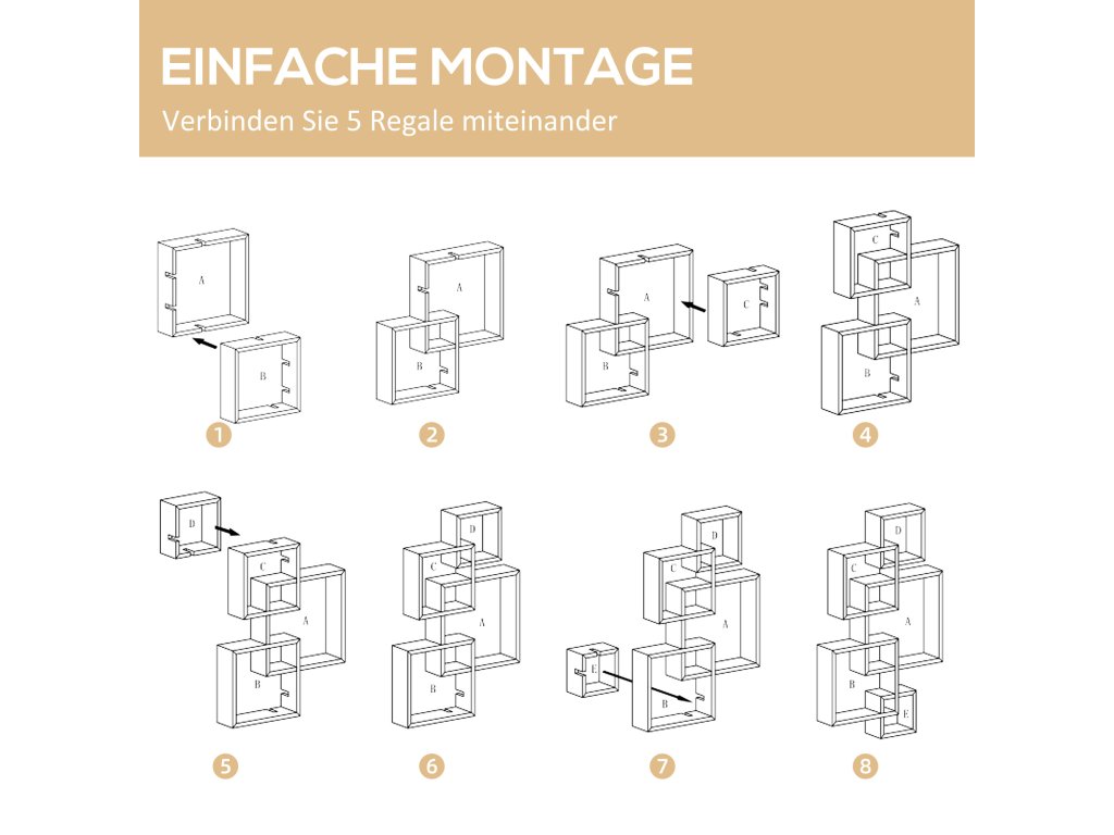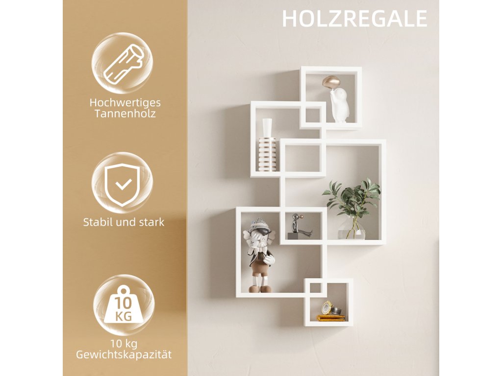 Tato nástěnná police od společnosti HOMCOM je nejen krásnou nástěnnou dekorací, ale nabízí také spoustu prostoru pro vystavení váz, knih, pokojových rostlin a mnoho dalšího. Závěsná police se skládá z pěti stylově uspořádaných kostek různých velikostí. Robustní rám je vyroben z lakovaného masivního dřeva, které se snadno čistí a je odolné.